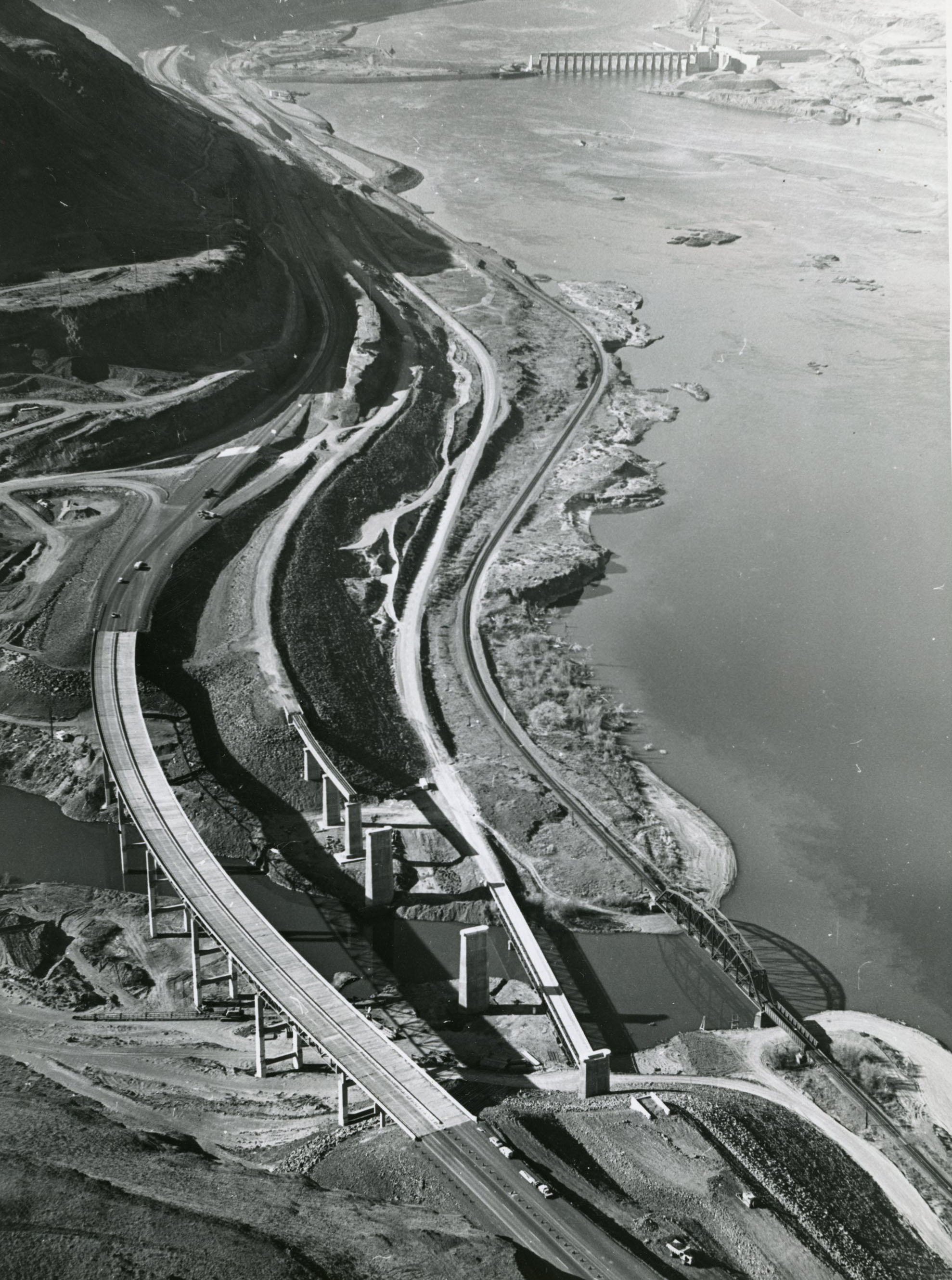 The mouth of the John Day River, flowing into the Columbia, 1964; John Day Dam in the background.
