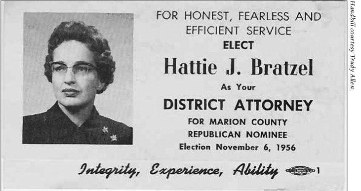 When Bratzel learned that some of her law school classmates were running for Marion County district attorney, she decided that she knew more about that work than they did and filed as a candidate. At that time, she later explained, "nobody wanted the political job," which usually went to a recent law graduate. In a contest against four men, she came in second. She ran again in the 1956 election and won, becoming the first female elected district attorney in Oregon. Living just a few blocks from the courthouse, Bratzel was usually on the scene when serious crimes or fatal accidents required the presence of someone from the district attorney’s office.