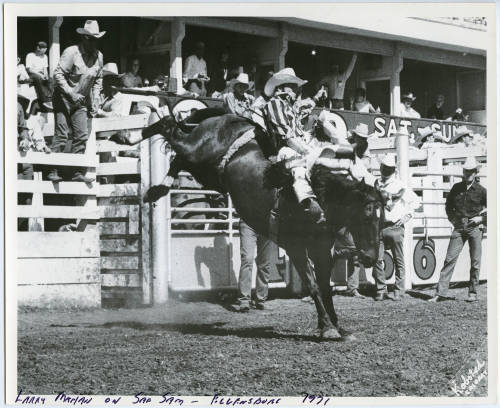 Larry Edward Mahan was born in Salem on November 21, 1943, the son of Ray and Reva (English) Mahan. The oldest of four children, he grew up in Brooks, near Salem. His parents bought him his first horse when he was seven or eight years old. Just weeks later, he entered calf-riding at a children’s rodeo at St. Paul and took home a six-dollar prize riding calves. When Mahan was ten, the family moved to Redmond, where at twelve years old he was in his first junior rodeo. When he was sixteen, Mahan returned to Brooks and attended North Salem High School, where he competed in wrestling and won District 8 A-1 championships in wrestling (at 141 pounds) in 1961 and 1962.