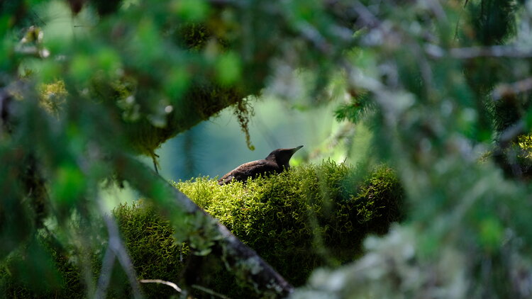 The species’ nesting sites—high in trees or on cliffs in rugged terrain in British Columbia and Alaska—are notoriously difficult to locate. While the birds are social on the water and when flying over nesting areas, their plumage is camouflaged when they are breeding, and they conceal their nests deep within the forest canopy. Early ornithologists surmised that murrelets could nest anywhere from offshore rocks to inland forests, but Indigenous people long believed that they nested in the forest, in tree cavities, in burrows in the soil, or under tree roots. Early naturalists likely did not consult Native Americans about their knowledge of this illusive bird.