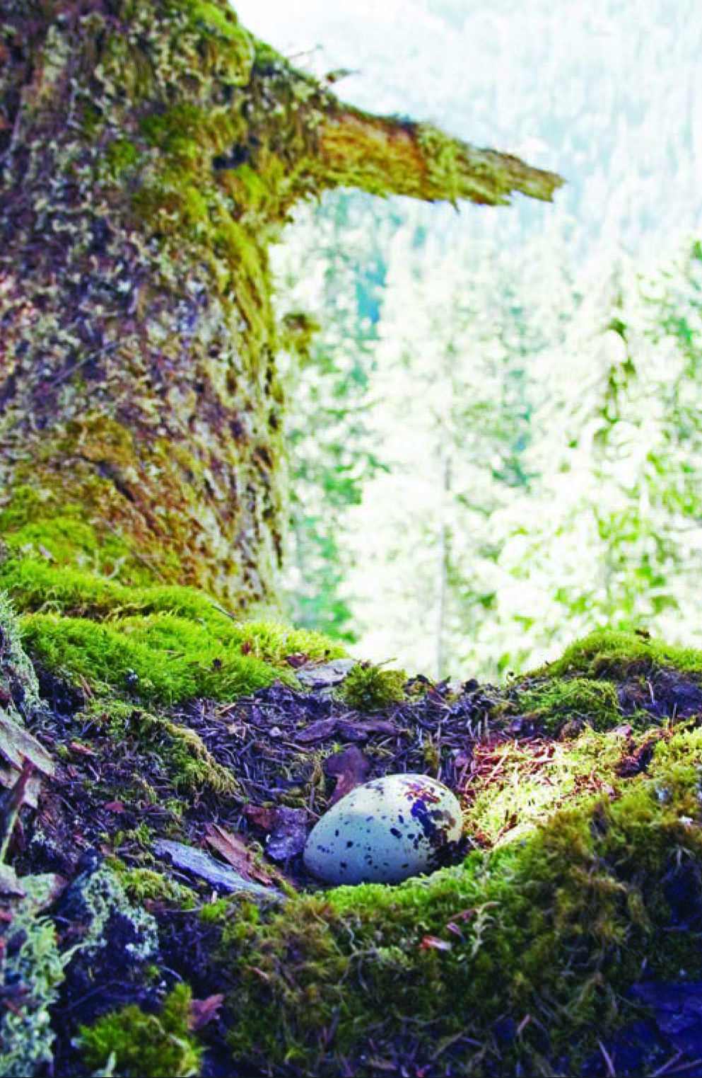 Marbled murrelets are small diving seabirds, related to puffins, that forage on schooling fish and invertebrates in the nearshore marine waters of the eastern Pacific, from central California to the Aleutian Islands. They fly as far as fifty miles inland to breed at low densities on the limbs of large trees in coastal coniferous forests, returning to the same site year after year. Murrelets lay a single egg on a moss or other substrate, and both adults participate in incubation, exchanging places every twenty-four hours, and in raising their chick.
