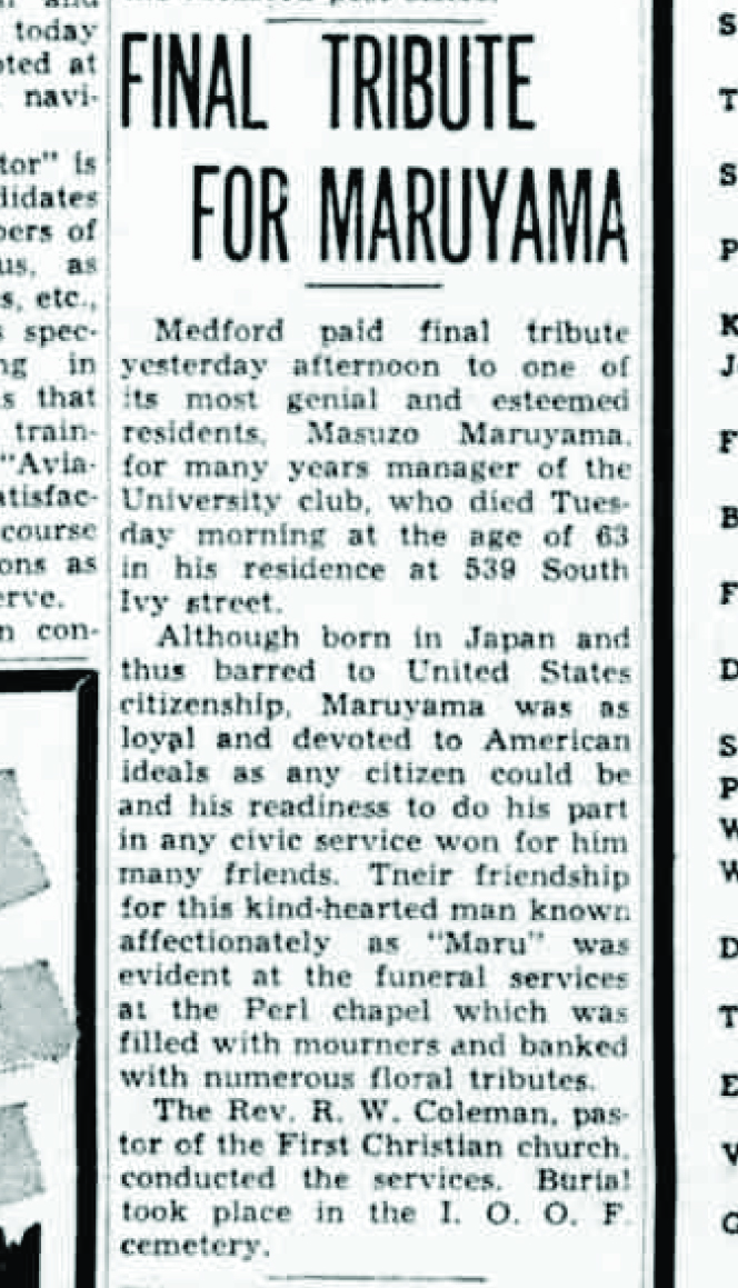 "Final Tribute for Maruyama." Medford Mail Tribune, September 19, 1941, p. 7.