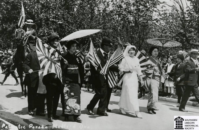 Parade in Medford, M. Maruyama walks on the far right, c. 1918.