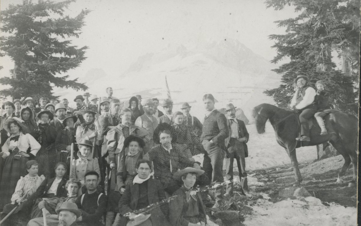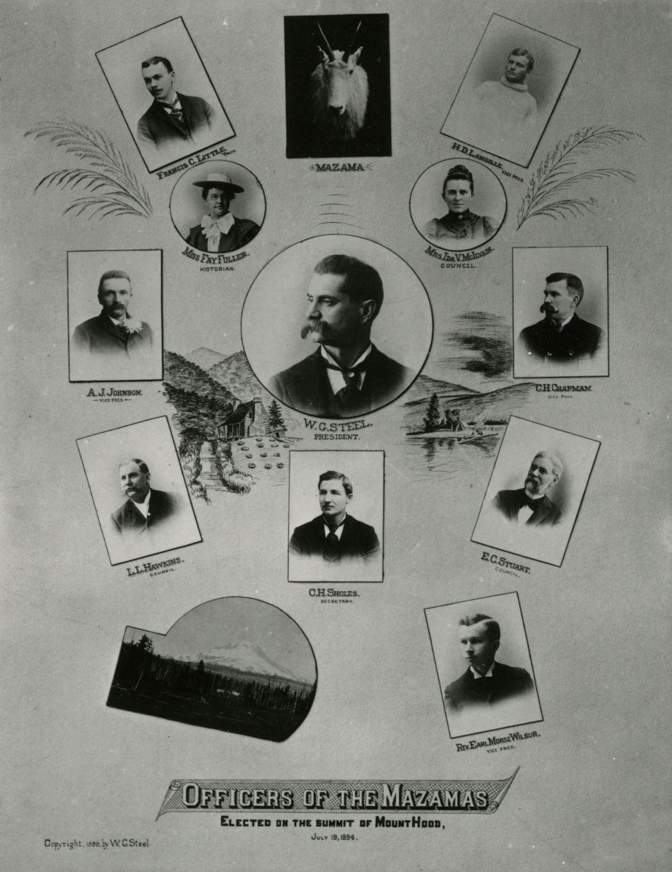 The group chose the summit of Mount Hood as the location to launch their new organization and placed an advertisement for the event in Northwest newspapers. On July 19, 1894, more than 350 people assembled near the hamlet of Government Camp at the base of Mount Hood. Despite the nasty weather, 155 men and 38 women reached the summit, where they elected Steel as the society’s first president.