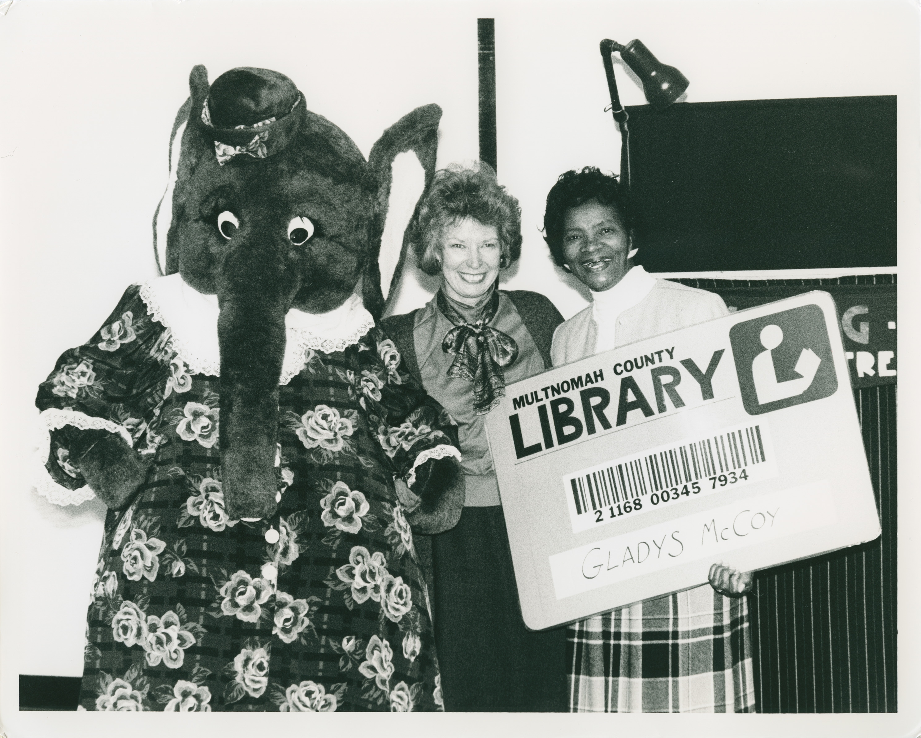 Gladys McCoy (right) and Multnomah County Library Director Sarah Long, with Rosie the Reader, c.1980s.