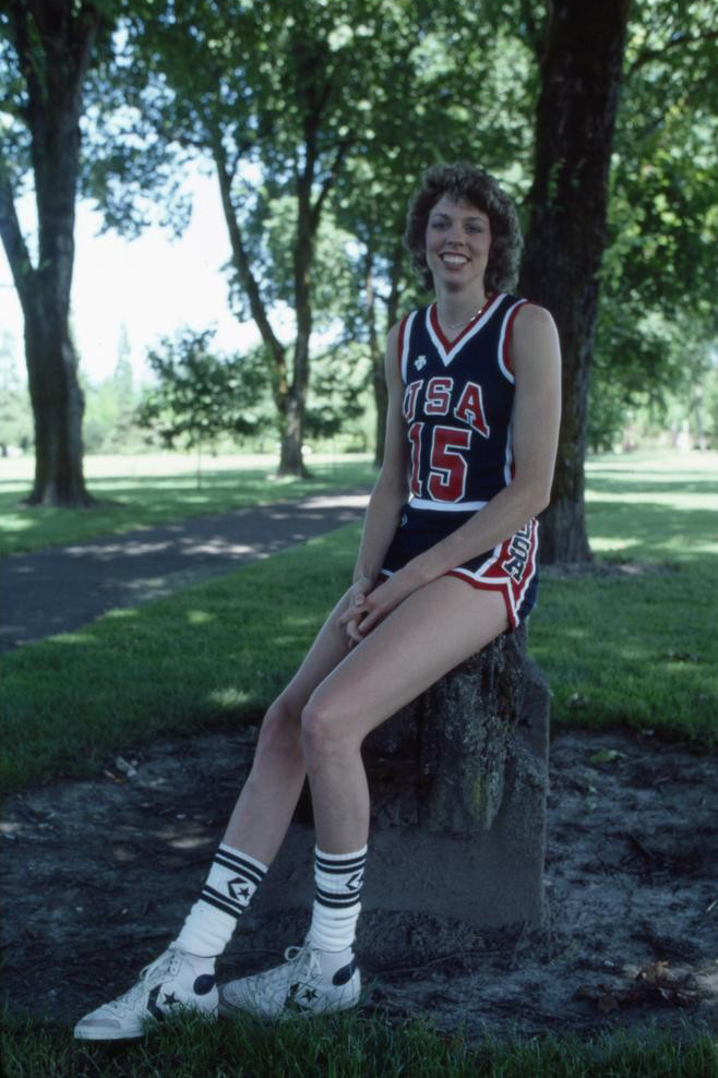 Carol Menken posing on Oregon State University campus in her Team USA jersey, 1984.