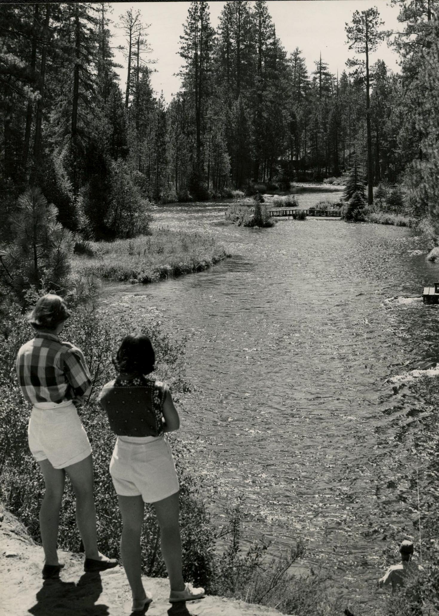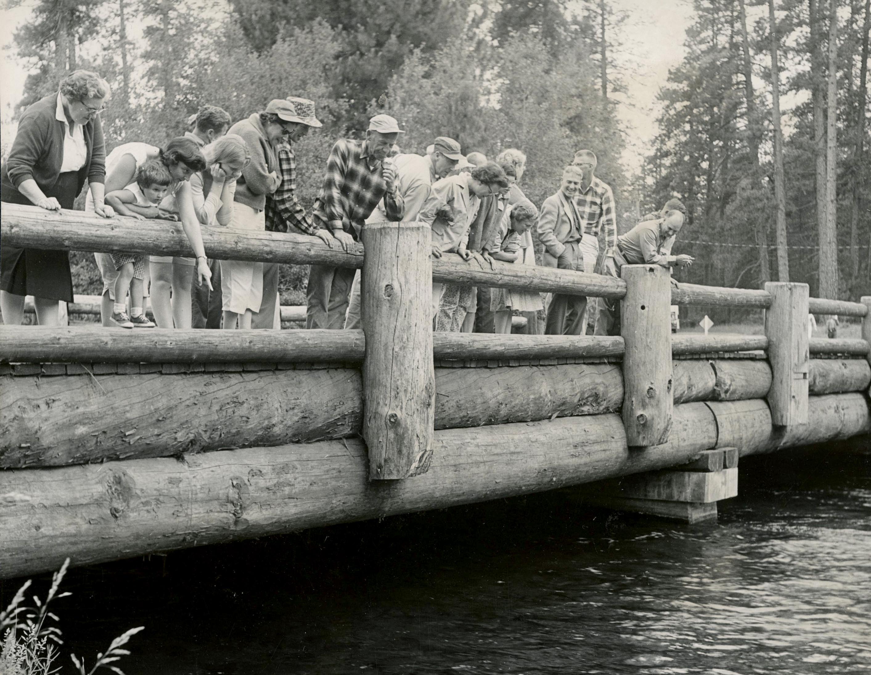 People watching fish from a bridge over the Metolius River, Camp Sherman--no fishing allowed, September 1961.