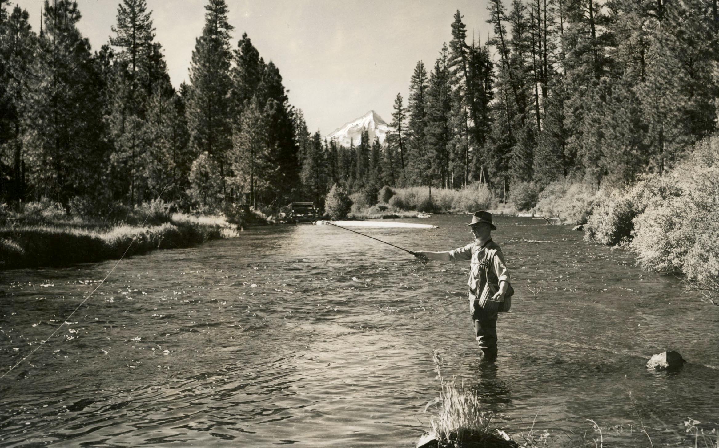 Fishing on the Metolius River, 1941, Mt. Jefferson in the background.