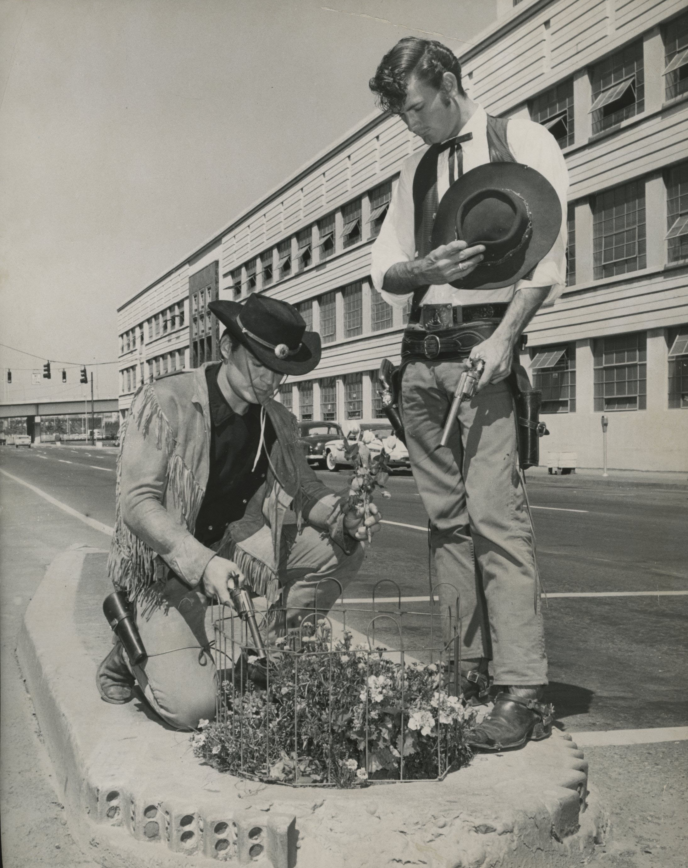 Two men plant the Yellow Rose of Texas in Mill Ends using a Colt 45 to blast the dirt, 1960.