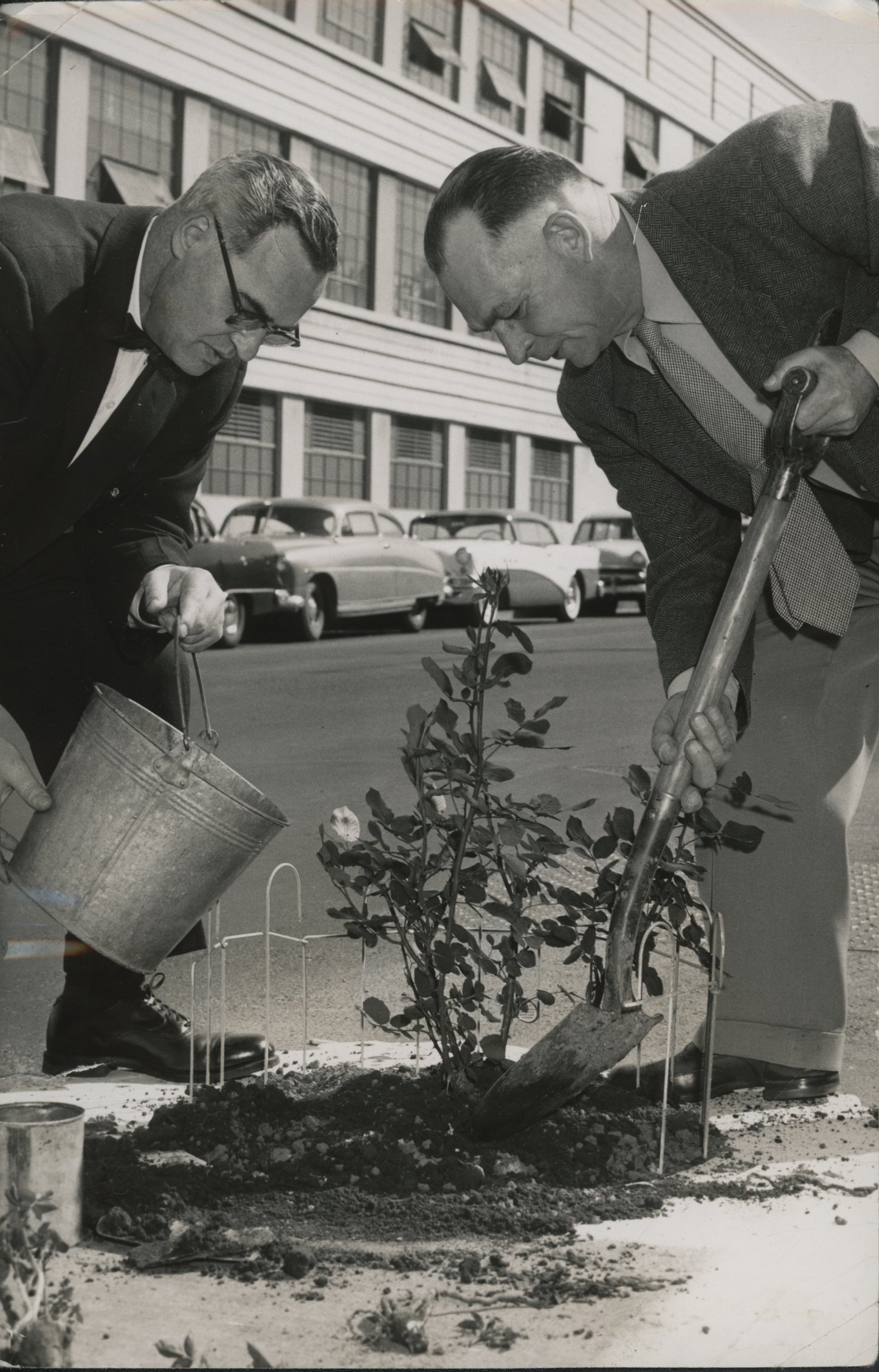 Commissioner Stanley Earl and Leo Faust, president of the Portland Rose Society, plant a rose for the 1955 Rose Festival.