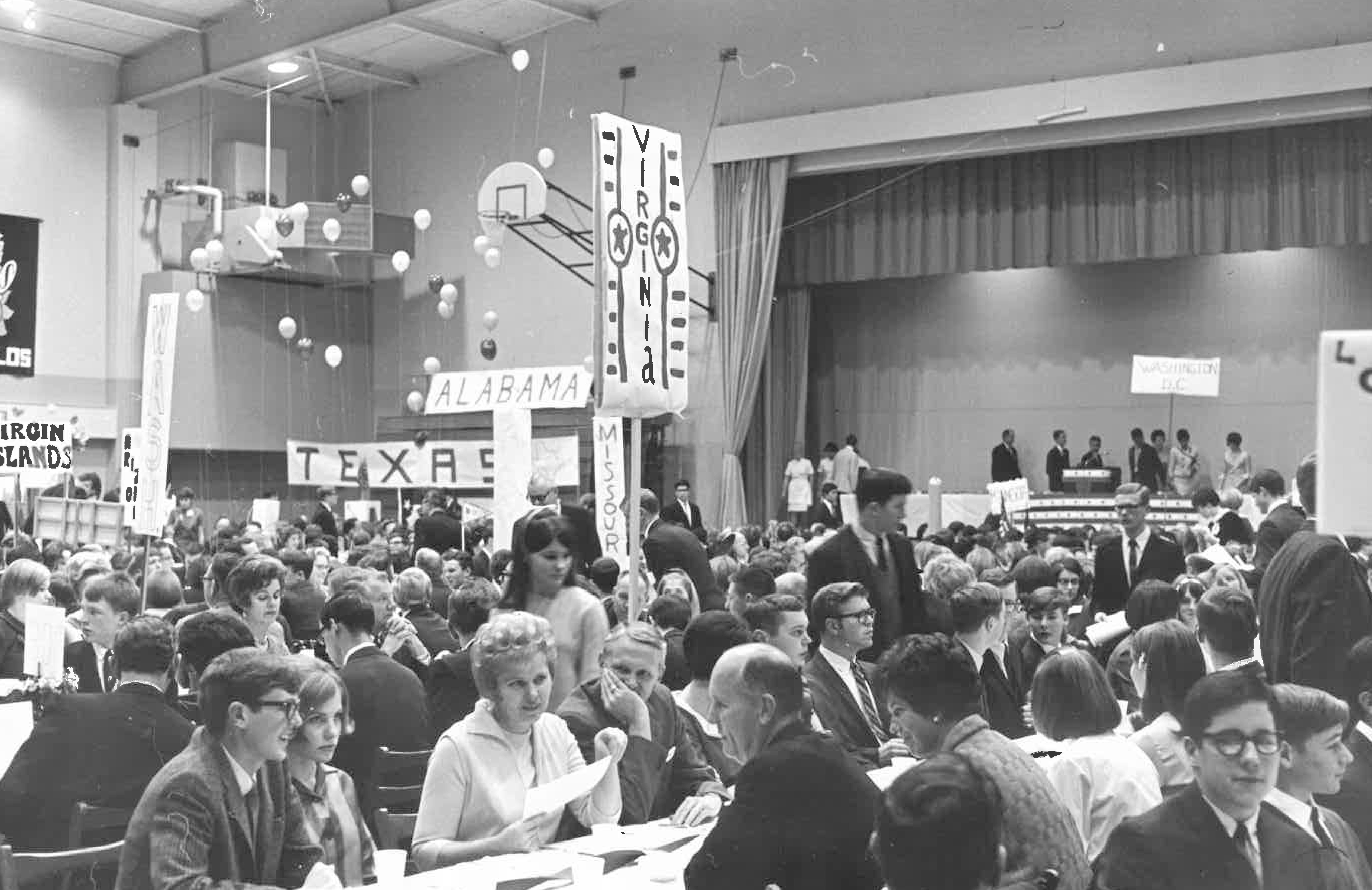 Every four years from 1964 to 2004, high school students from Oregon and other western states organized into state delegations for the Oregon High School Model Presidential Nominating Convention. They researched the policy positions of one of Oregon’s political parties to prepare for deliberations that included establishing a party platform, evaluating the credentials of delegations, and nominating a candidate for president. The first conventions were organized by Sunset High School, and beginning in 1972 they were sponsored by the Oregon Council for Social Studies.