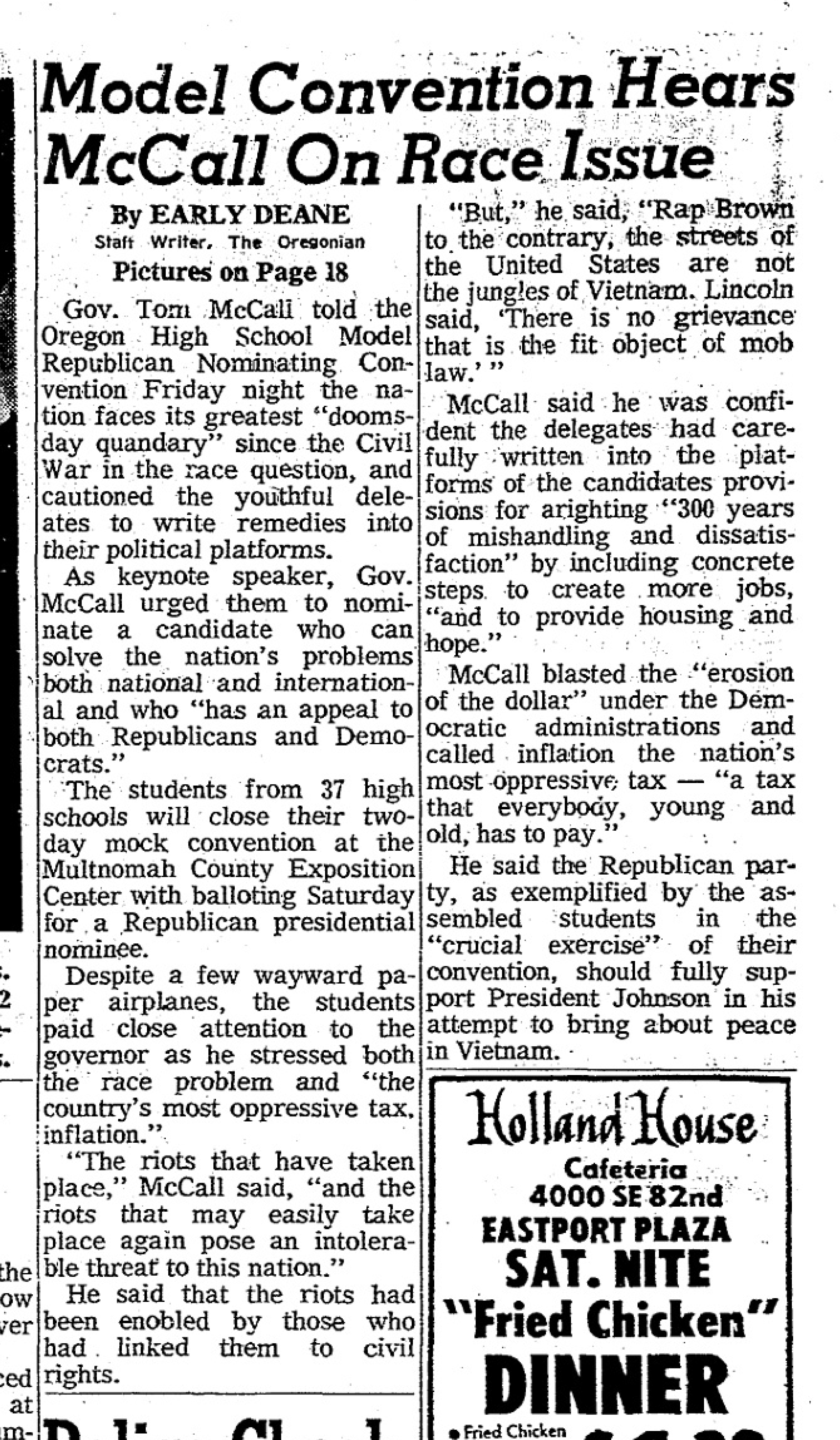 "Model Convention Hears McCall on Race Issues," Oregonian, May 11, 1968.