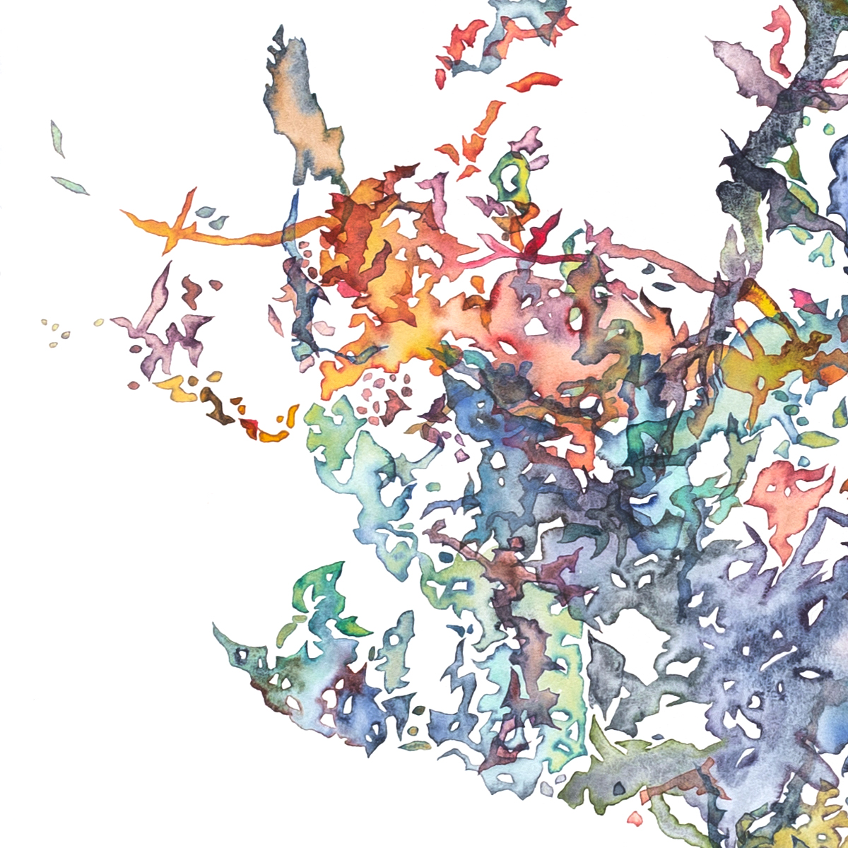 Each New Earth painting overlays craggy shapes in delicate colors, tracings that are meticulously culled from NASA satellite imagery. As glaciers melt, raw patches of earth are exposed—pieces of terra firma that Molnar compares to wounds. She traces the patches, scales them down, and then outlines their contours with watercolor paints made from powdered elk bones, berries, brick, carbonized devil’s club, and metal trash. By layering one watercolor shape on top of another, she creates an aggregate map of loss. The series, which has been exhibited in New York, Portland, and Boise, has no foreseeable end.