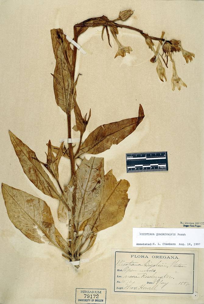 Tobacco was cultivated by many Native groups in western North America who actively managed plants by burning, pruning, and harvesting them selectively to enhance productivity. It was often the only plant for which some groups purposefully prepared the soil and planted seed, including by people who lived beyond tobacco’s natural range. There is evidence to suggest that Nicotiana quadrivalvis gardens were maintained among the Haida, Tsimshian, and Tlingit of British Columbia and southeast Alaska, indicating that tobacco had been spread through trade and intentionally cultivated before encounters with non-Natives. Scottish botanist David Douglas reported finding a tobacco garden near a village on the Multnomah River (the present-day Willamette River) in 1825: "An open place in the wood is chosen where there is dead wood, which they burn, and sow the seed in the ashes….I met the owner who…told me that wood ashes made it grow very large."