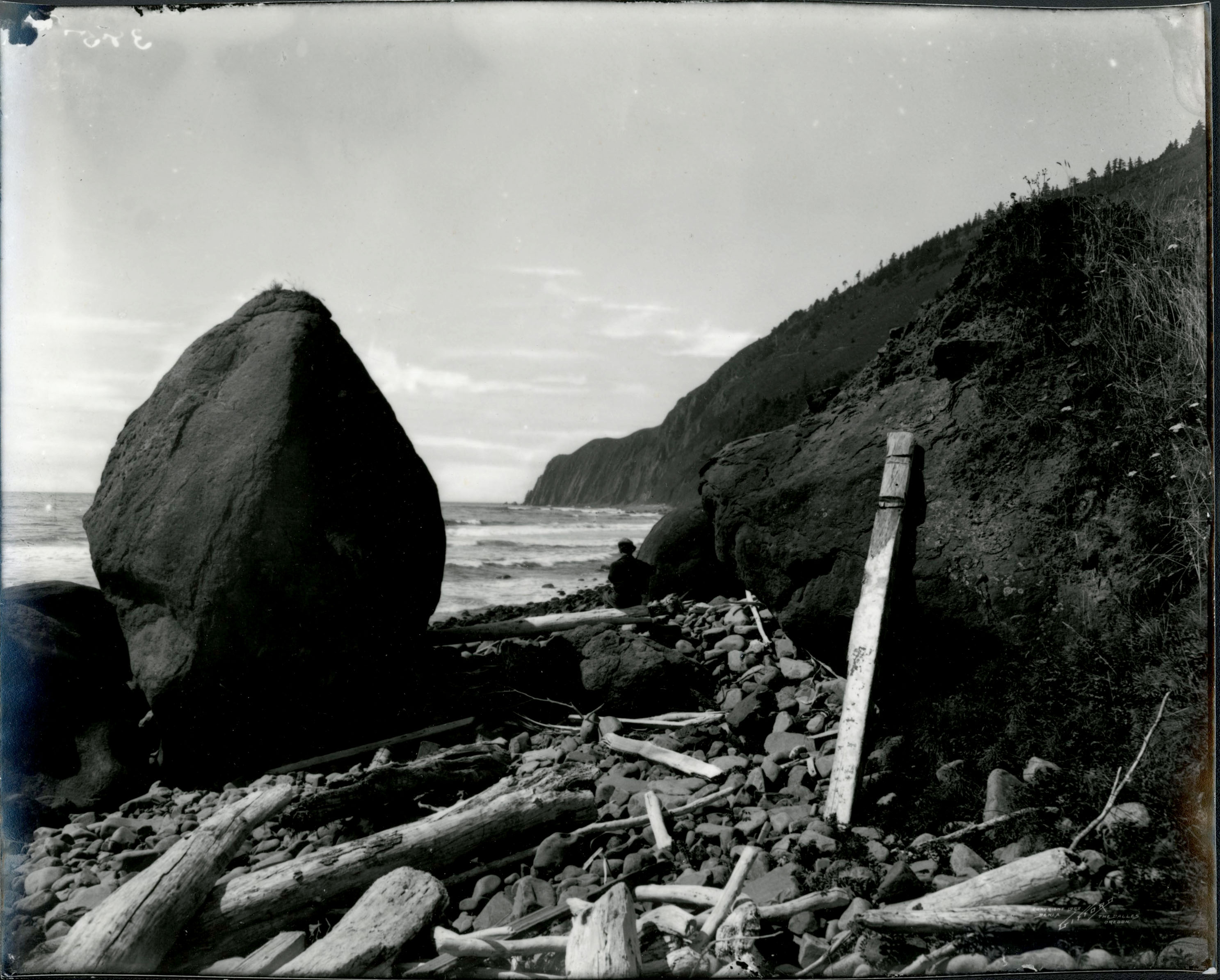 During the late nineteenth century, EuroAmerican settlers found large stones inscribed with puzzling marks on and near Neahkahnie Mountain. Many thought the stones were treasure maps, a theory fueled by Native stories that mentioned a European ship dropping anchor near Neahkahnie and sending a boat ashore with crew, who buried a large box on the mountain’s southwest face, placed a marker on it, and sailed away. Wayne Jensen, director of the Tillamook Pioneer Museum (1976-2003), theorized that the stones were from a cartographic survey by Sir Francis Drake, who landed on the west coast in 1579 to careen his ship, the Golden Hinde, while circumnavigating the globe. The actual careening site has never been conclusively determined, however, and in 2012 the National Park Service declared Drakes Bay, at Point Reyes National Seashore in California, as the “likeliest spot” and the federally recognized location. Nevertheless, the notion that Drake careened his ship in Nehalem Bay and surveyed Neahkahnie Mountain to claim the lands for the English crown remains popular on the north coast.