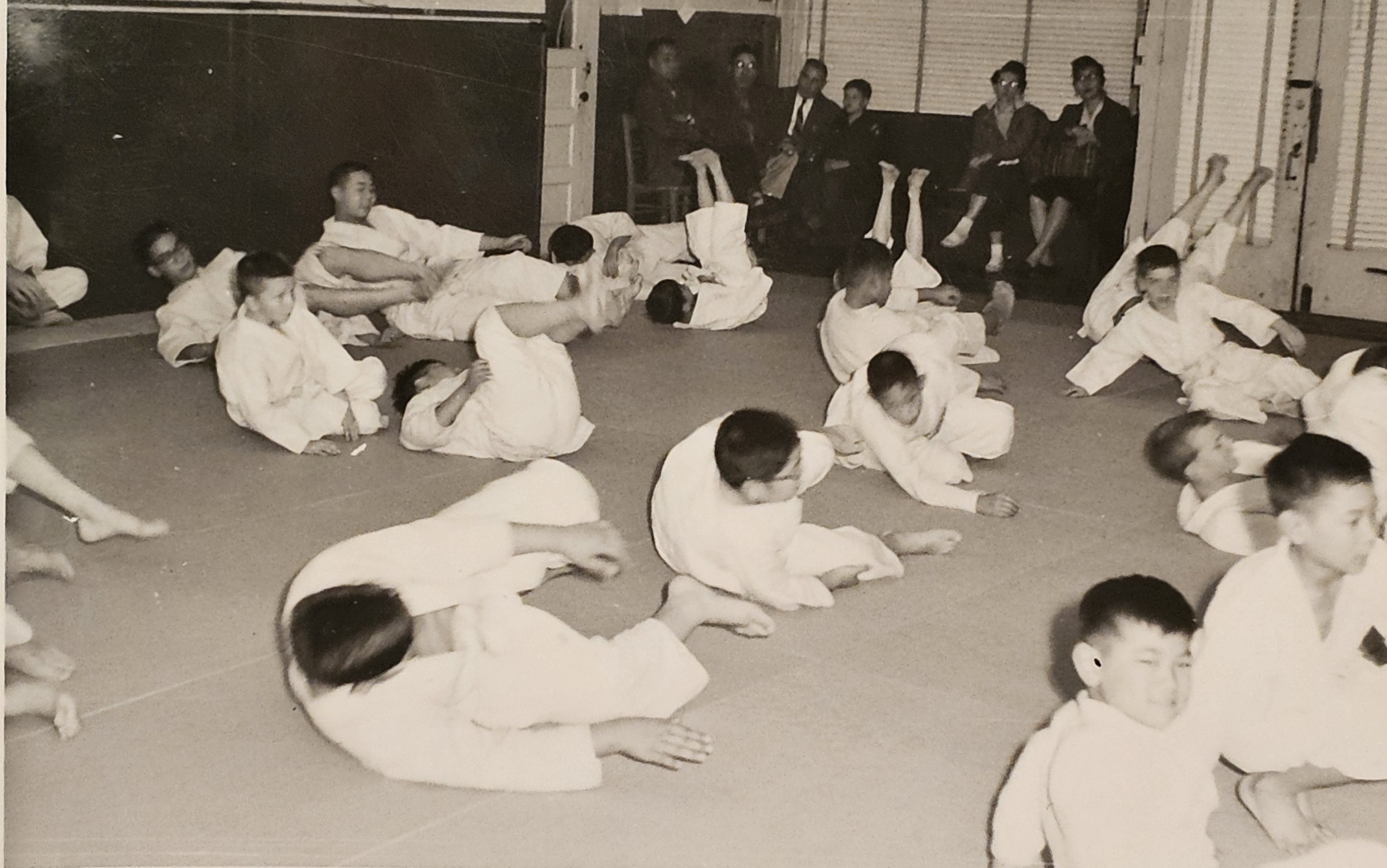 Obukan Judo students practicing breakfalls (ukemi) at the Russell Street Obukan Dojo location, 1958.