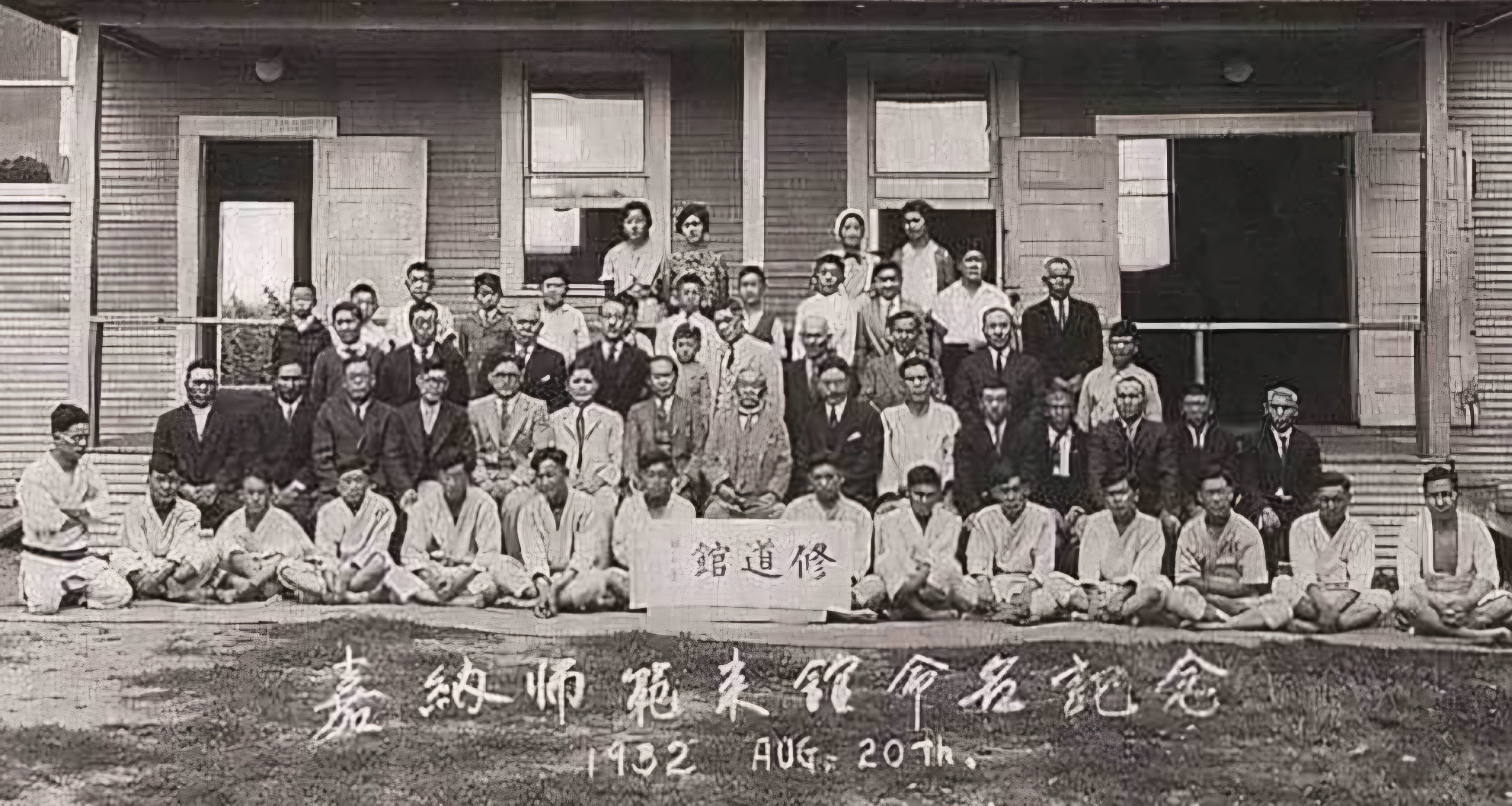 Obukan Judo members with Kano Shihan, seated in the second row center, 1932.
