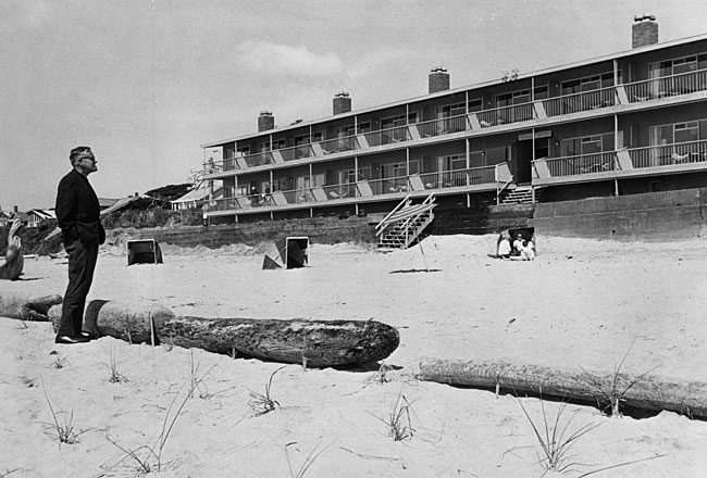 In the summer of 1966, however William Hay, owner of the Surfsand Motel in Cannon Beach, asserted his property rights. He placed large driftwood logs to block off a section of the dry sand area in front of the motel, setting up umbrellas and tables within the enclosed area and posting private property signs on the perimeter. Governor West’s legislation did not say what most Oregonians thought it said. Only the wet-sand portion of the state’s beaches had been set aside as a state highway, and many landowners along the coast had deeds with rights to develop the dry-sand areas. According to the Oregon Parks and Recreation Advisory Committee, 112 of the 262 miles of beach property were privately owned.