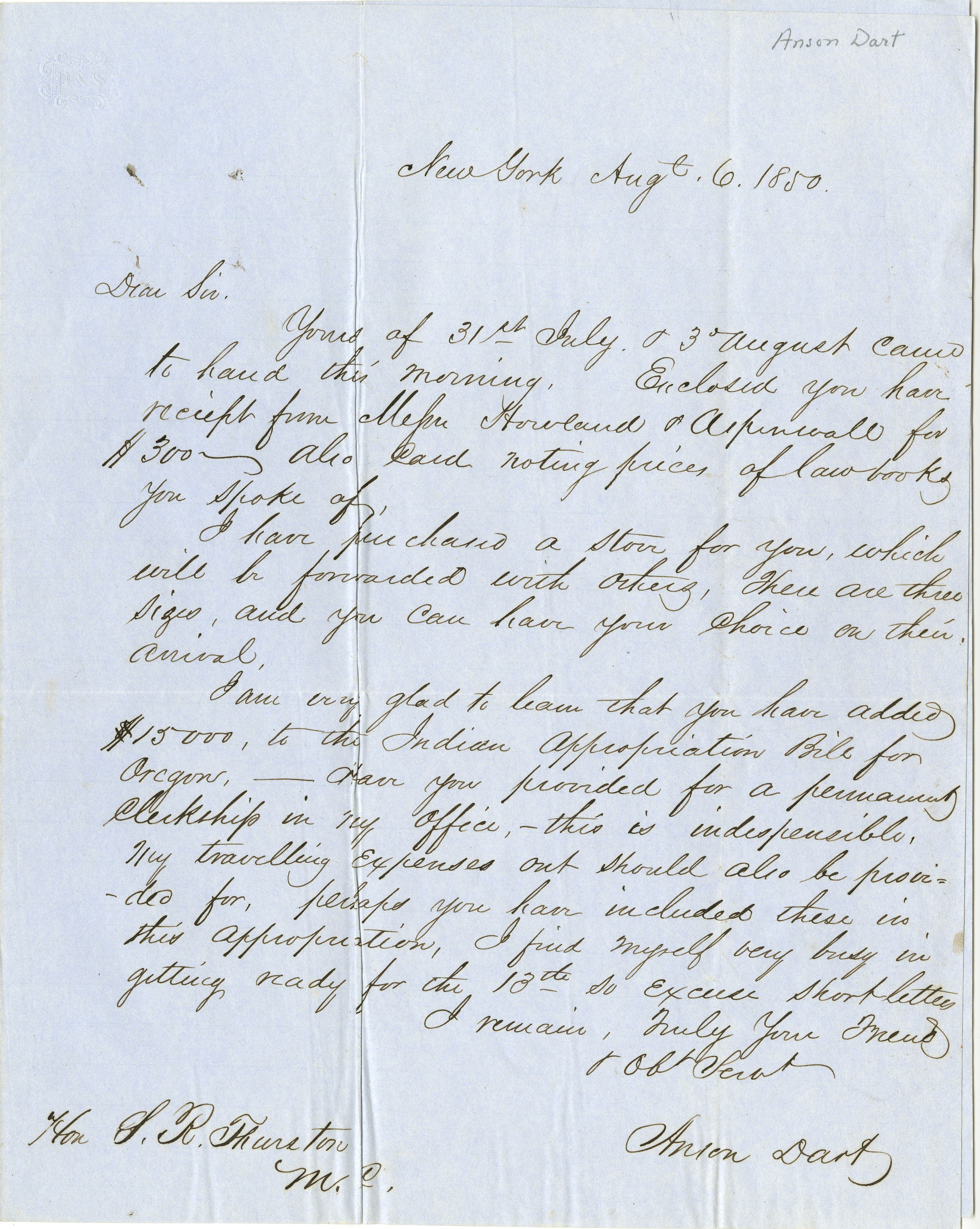 Letter from Anson Dart to Thurston, Aug. 6, 1850.