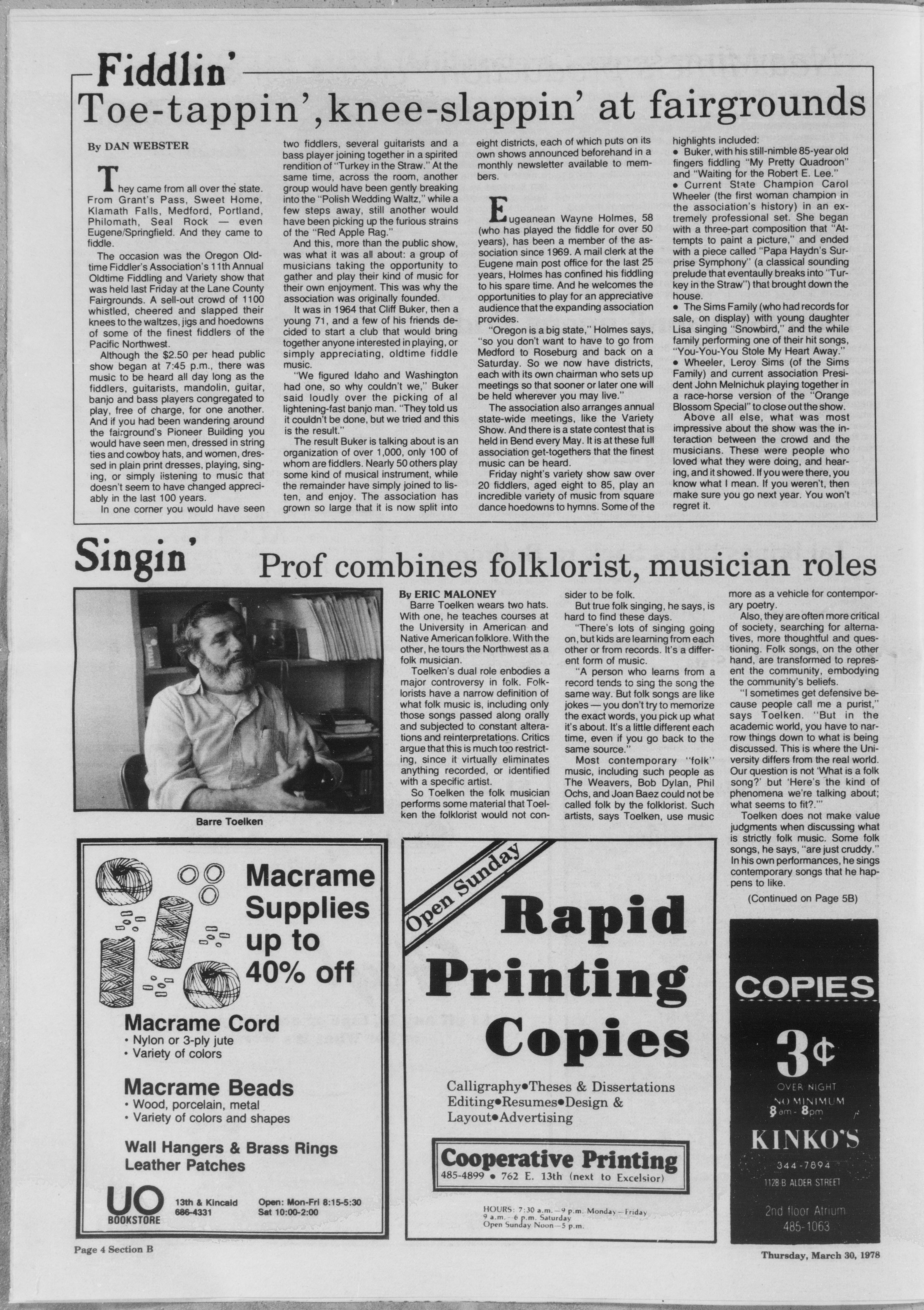Oregon Daily Emerald newspaper article about the Oregon Old Time Fiddlers Association, Eugene, March 30, 1978.
