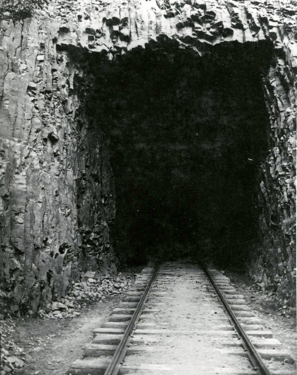 ![]()  Tracks of the OR&N Line enters tunnel blasted through solid basalt. Courtesy Oregon Hist. Soc. Research Lib., 016358