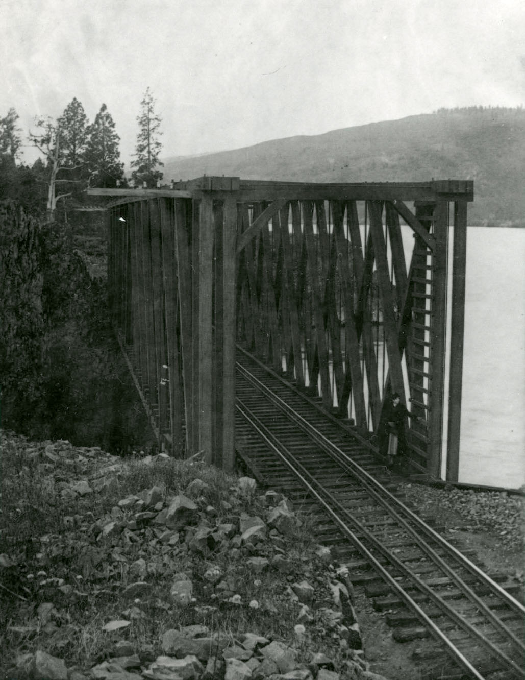 ![]()  OR&N wood trestle bridge spans cliffs of a small gulch along the Columbia River. Courtesy Oregon Hist. Soc. Research Lib., 016357