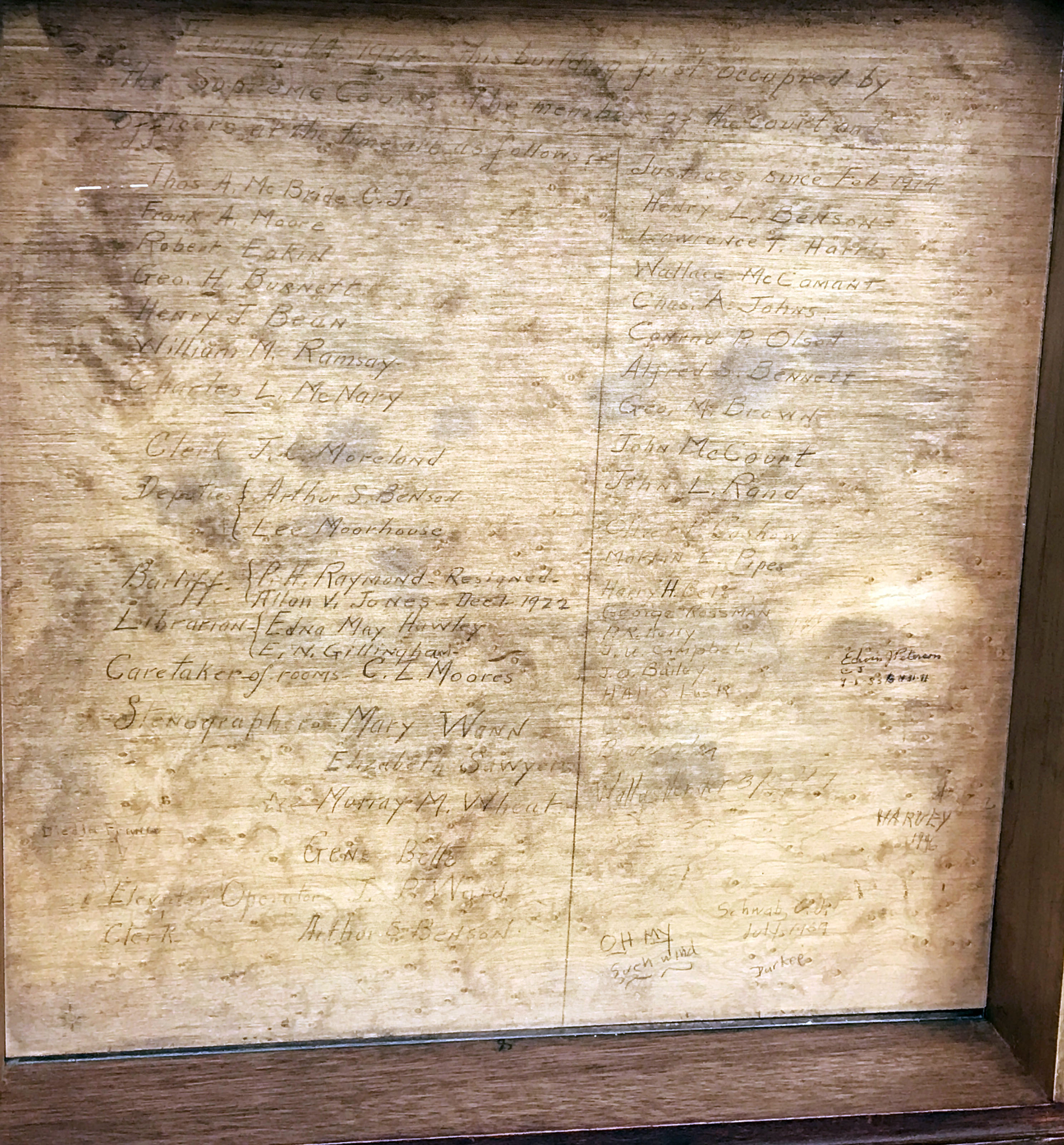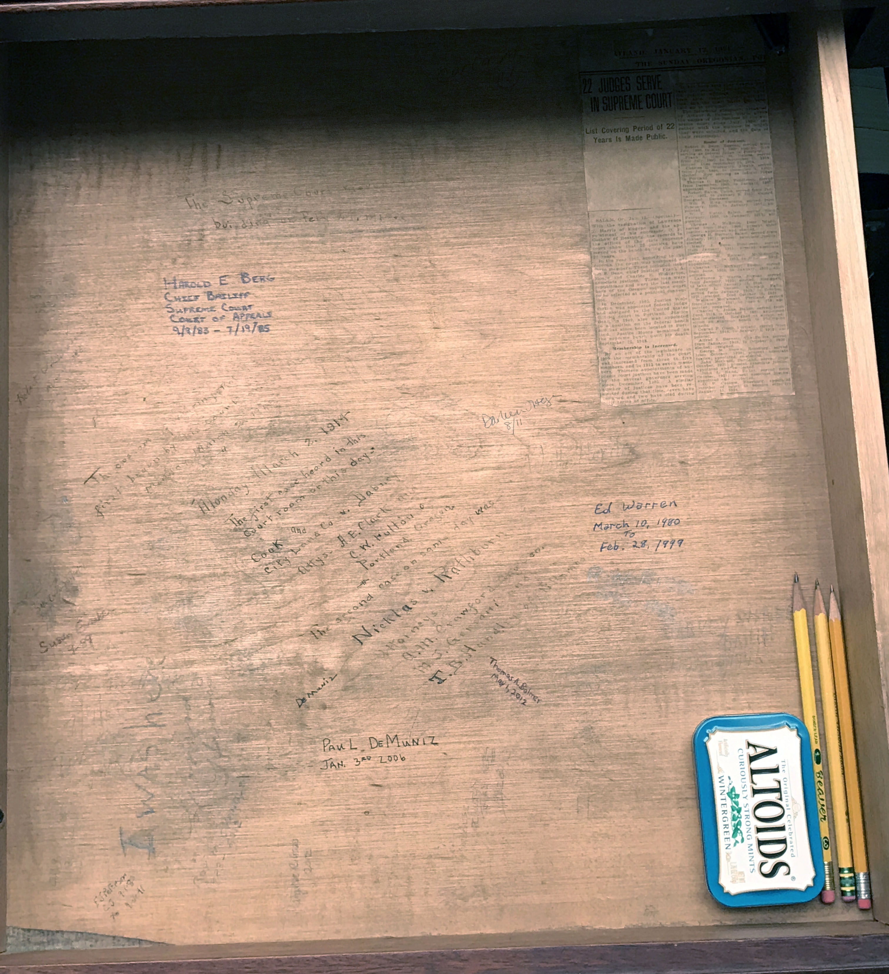 The original furnishings in the courtroom include the bench where the seven justices sit (the court was expanded to seven justices in 1913). Over the years, many notes have been penciled on the bottom of the drawers. One note, in a drawer at the Chief Justice’s desk, reads “February 14, 1914. This building first occupied by the Supreme Court,” followed by a list of the justices and officers of the court at the time. Since then, the names or initials of nearly every justice to serve the court have been added.
