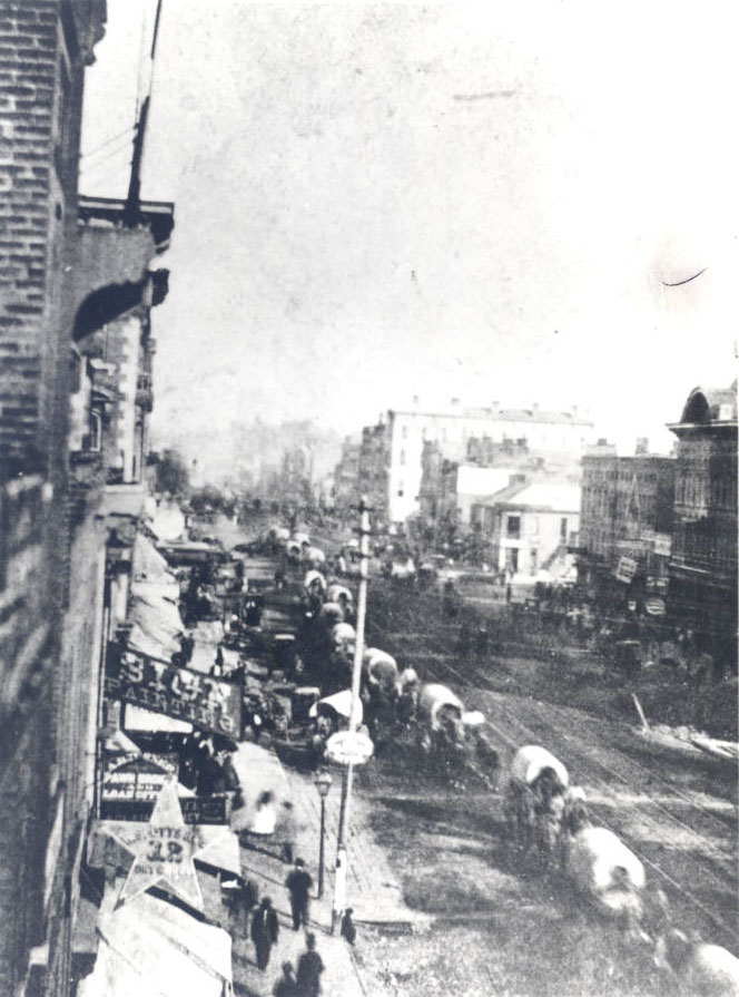 A departing wagon train during a re-enactment, c. 1890. Unknown location.