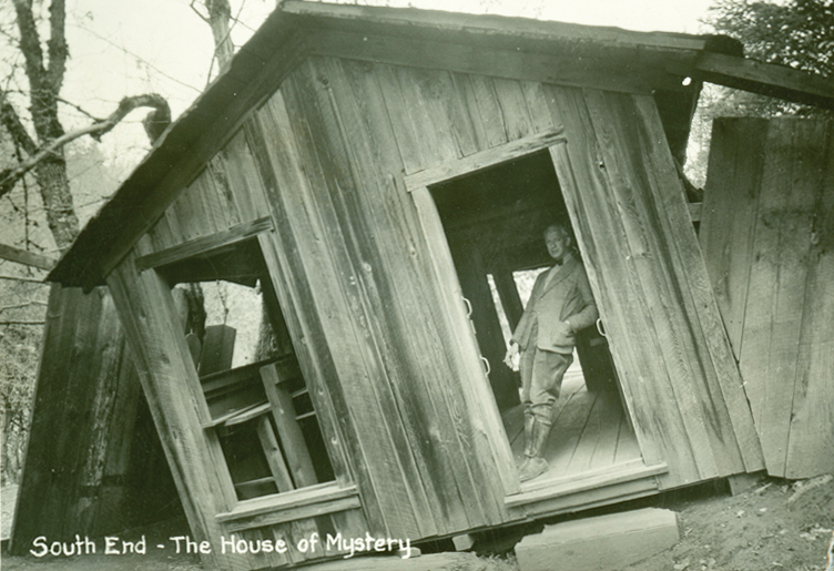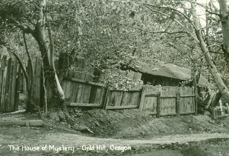 The Oregon Vortex and House of Mystery, located on Sardine Creek in Gold Hill, is one of Oregon’s oldest and most original examples of Roadside Americana. Opened to tourists in 1930, the attraction is the earliest documented mystery spot or gravitational hill in the United States—a place where bubble levels, tape measures, yardsticks, balls that roll uphill, and plumb lines are used to demonstrate the phenomena.