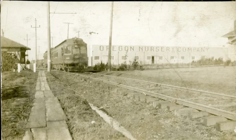 In 1906-1907, the Oregon Electric Railway surveyed a line from Portland, south to Salem and Eugene and west to Hillsboro and Forest Grove. Right-of-way was granted through Oregon Nursery land along present-day Cornell Road. Regular service began in 1908, with the railway providing commuter services and convenient transportation of nursery products.