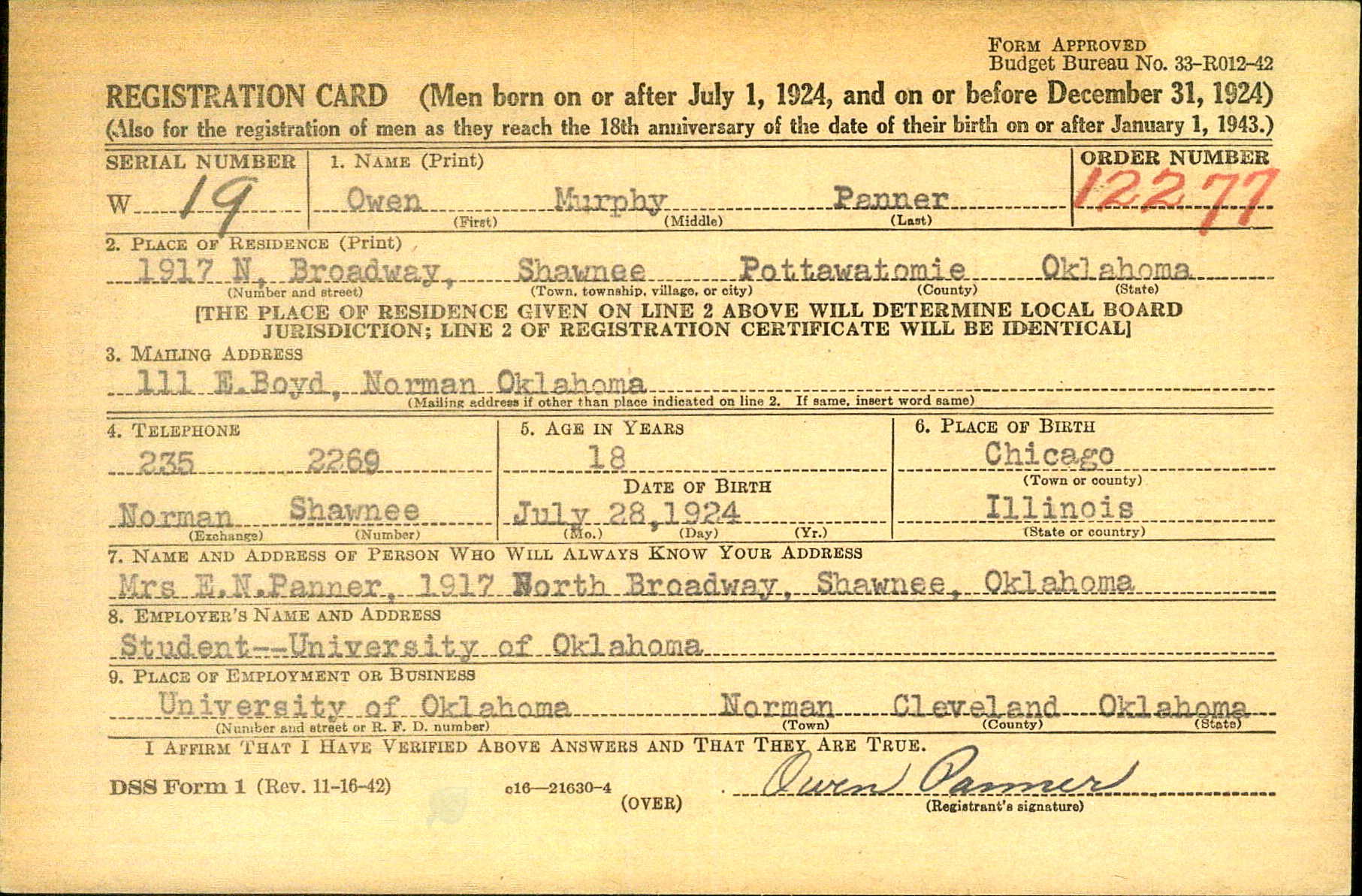 U.S. WWII draft card for Owen Panner.