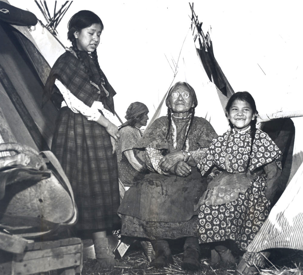 Anne Johnson (Umatilla), center, with great-grandchildren Pauline Sam and Anna Marie Chapman, Pendleton Round-Up, 1961.