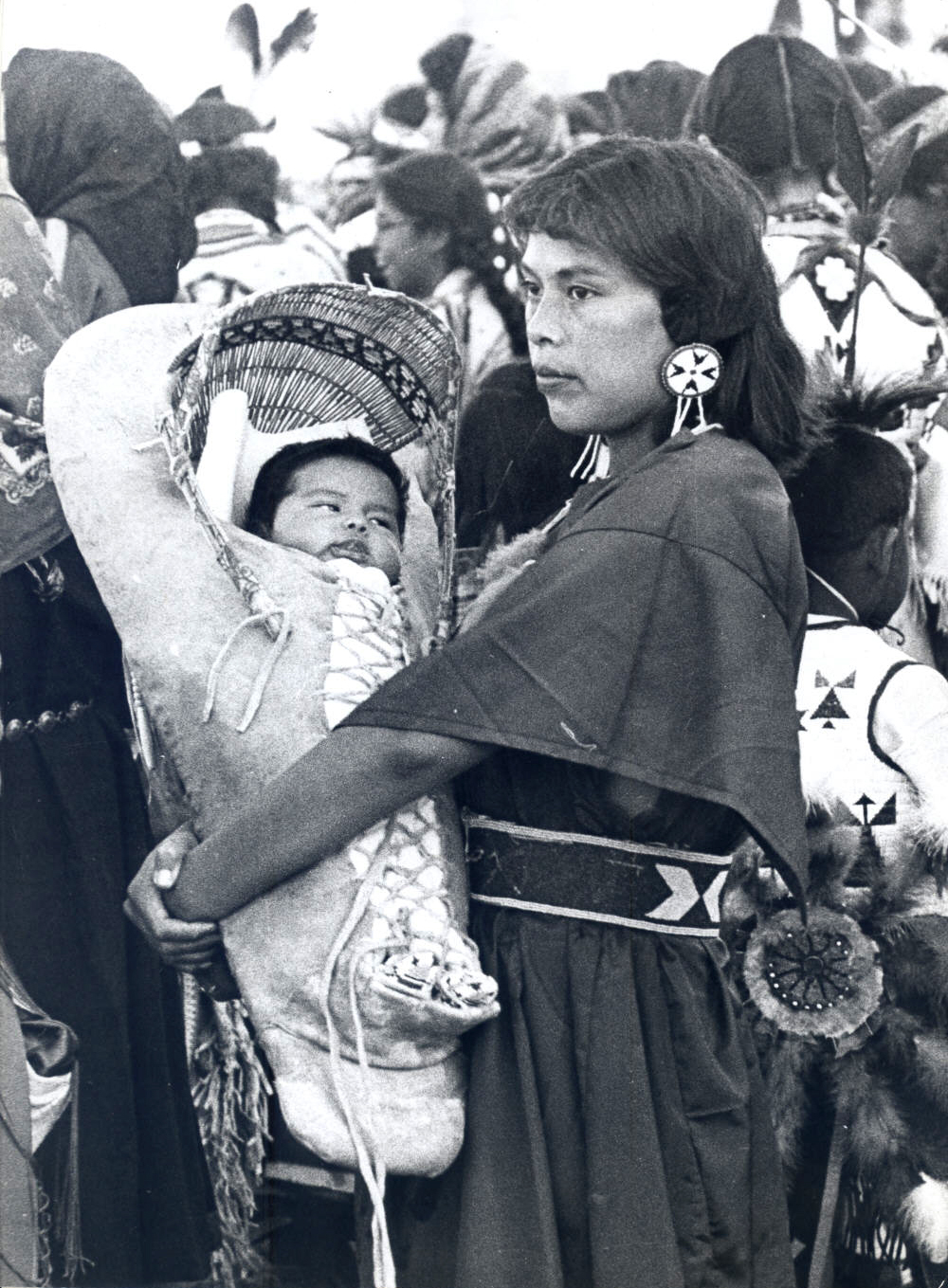 Native woman and a baby in a cradleboard, Pendleton Round-Up, 1961.