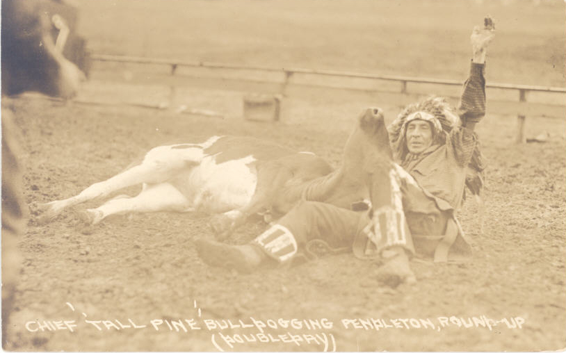 Chief Tall Pine (Umatilla) bulldogging, Pendleton Round-Up, c. 1924.