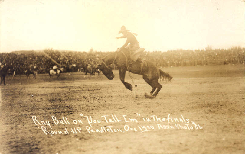 Ray Bell on "You-Tell-Em" in the finals, Pendleton Round-Up, 1920.