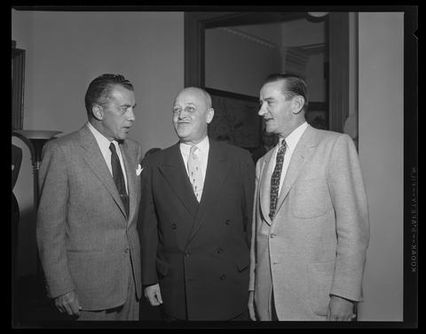 Ed Sullivan (left) visiting with Portland Mayor Fred Peterson and an unidentified man (right). Sullivan visited Portland to take part in the 1954 Portland Rose Festival.