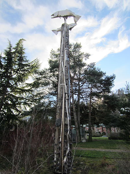 Sculpture by Lillian Pitt at the Native American Student and Community Center, Portland State University, 2012.