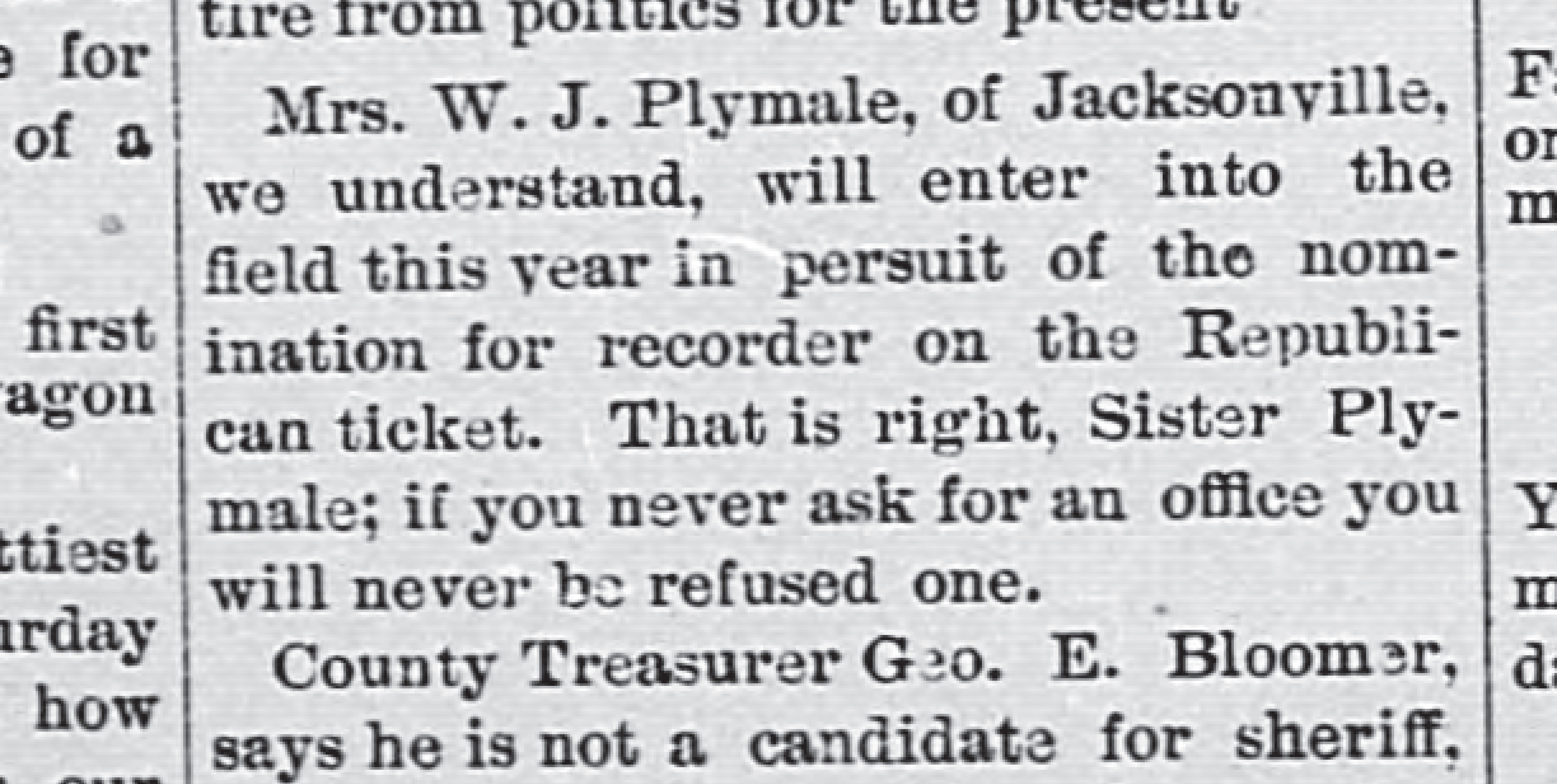 "Mrs. W.J. Plymale, of Jacksonville, we understand, will enter into the field this year in persuit (sic) of the nomination for recorder on the Republican ticket.” Medford Mail, February 4, 1892, p. 3.