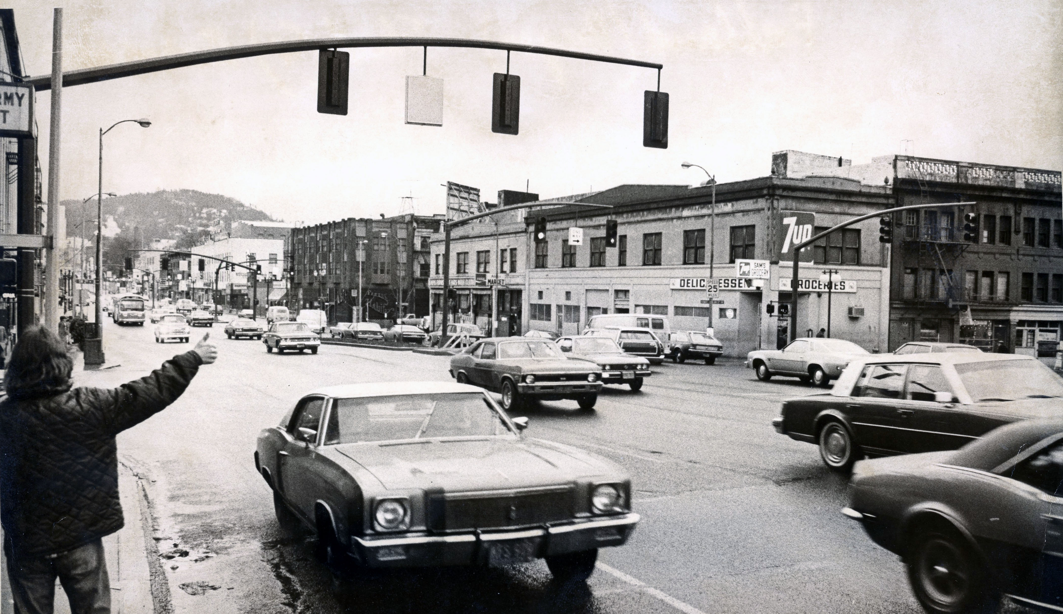Second Ave and West Burnside, 1976. Pomona Hotel can be seen at far right..