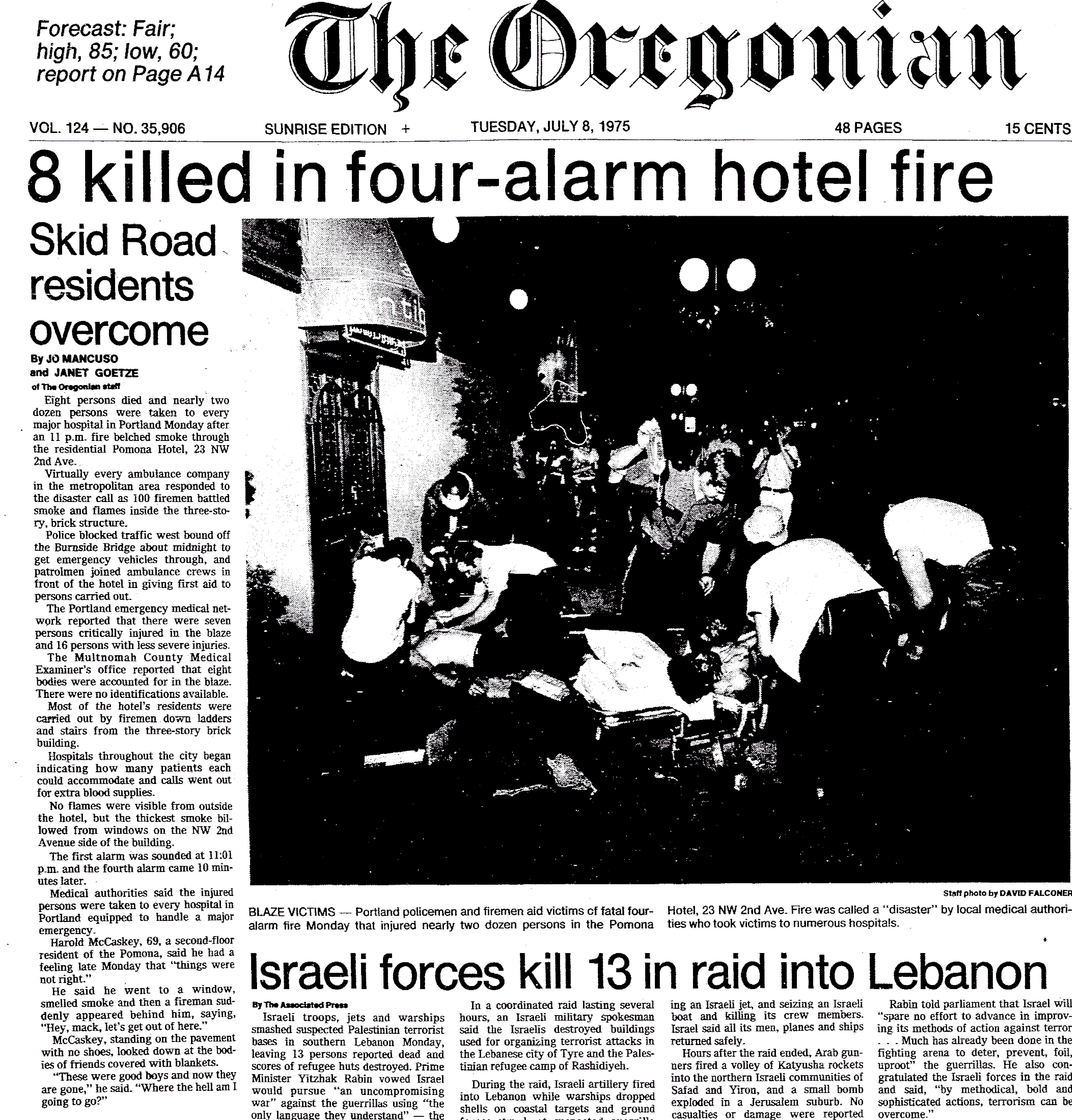 "8 killed in four-alarm hotel fire," Oregonian, July 8, 1975.