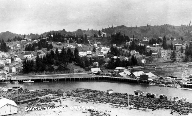 Yaquina River, city of Toledo, and C.D. Johnson mill (center), 1930s. Courtesy Lincoln County Hist. Soc.
