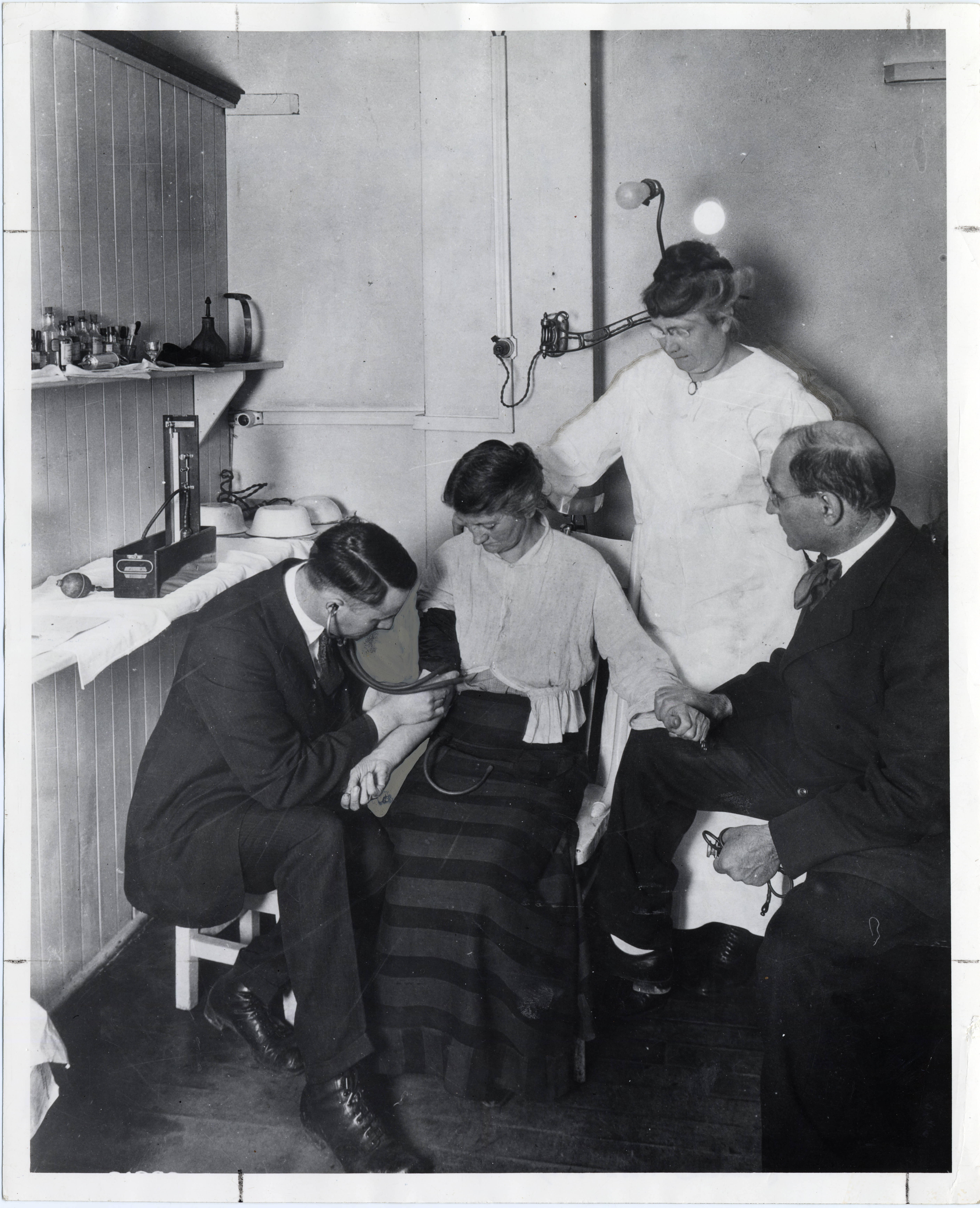 Physician examining a woman at the Portland Free Dispensary, c.1920.
