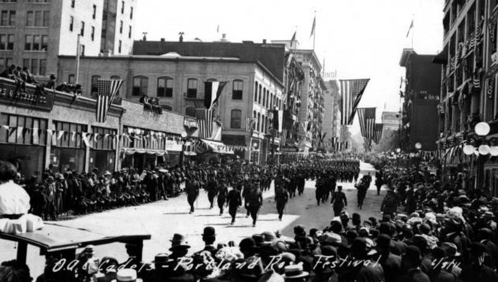 Cadets marching in the Rose Festival Parade, Portland, 1911.