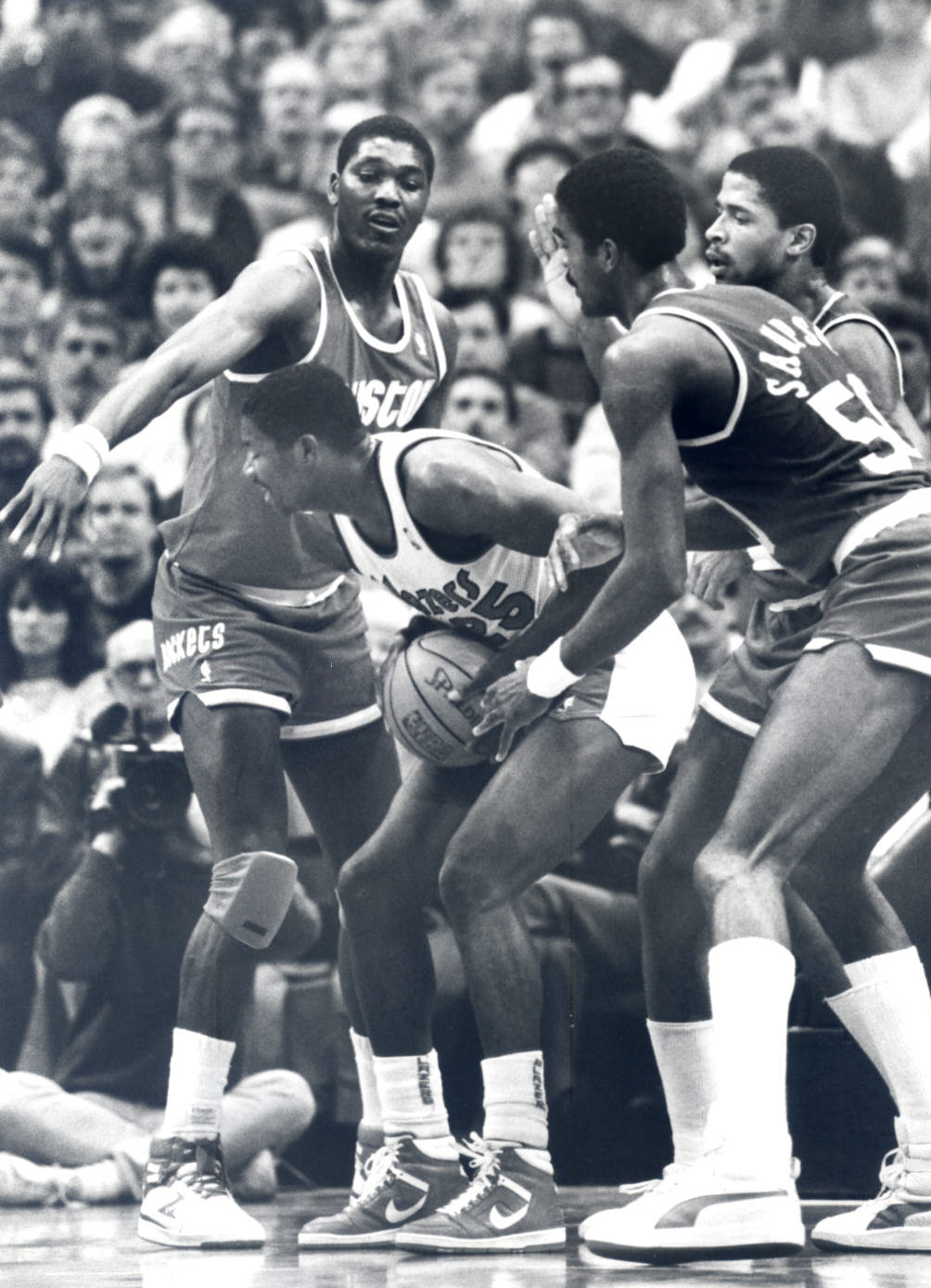 Sam Bowie (left) and Clyde Drexler (22) Courtesy Oreg. Hist. Soc. Research Library, Max Gutierrez Collection, OrHi98380