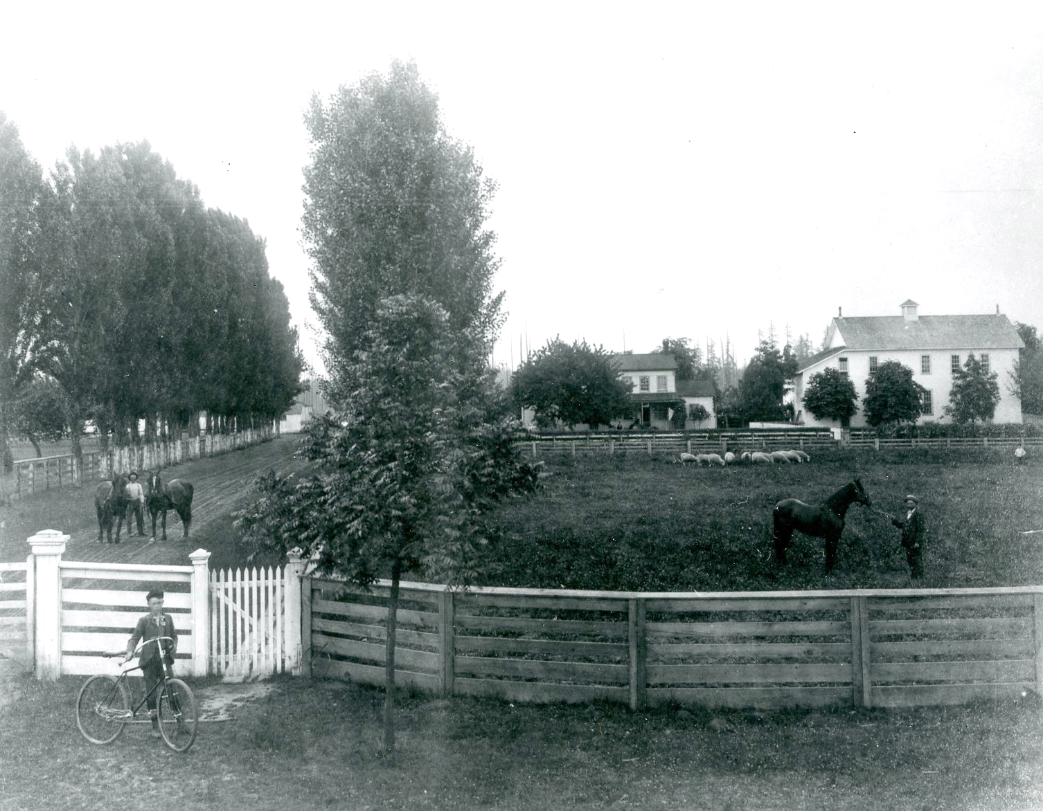 Reed and W. S. Ladd had begun purchasing farms in 1871 and owned three major properties: Broadmead, near Amity; Reedville, between Beaverton and Hillsboro; and Bachelor Island, on the Washington side of the Columbia River near Sauvie Island. The farms were used for some experimental crops, but Reed’s major interest was in breeding livestock. He imported pure-blooded hogs, sheep, cattle, chickens, and horses, including Shorthorn and Ayershire cattle and Cotswold sheep from England and Scotland. Broadmead was devoted to cattle, and Reedville was a horse farm, where Reed built a covered mile-long track and raised and raced trotting horses. Bachelor Island was originally purchased to provide pasture and grain lands but eventually became the home for purebred stock. Reed also invested in Portland real estate, and in 1886 built the Abington Building, the first five-story building in Portland (demolished in 1967), and became part owner of the Portland Hotel (demolished in 1951).