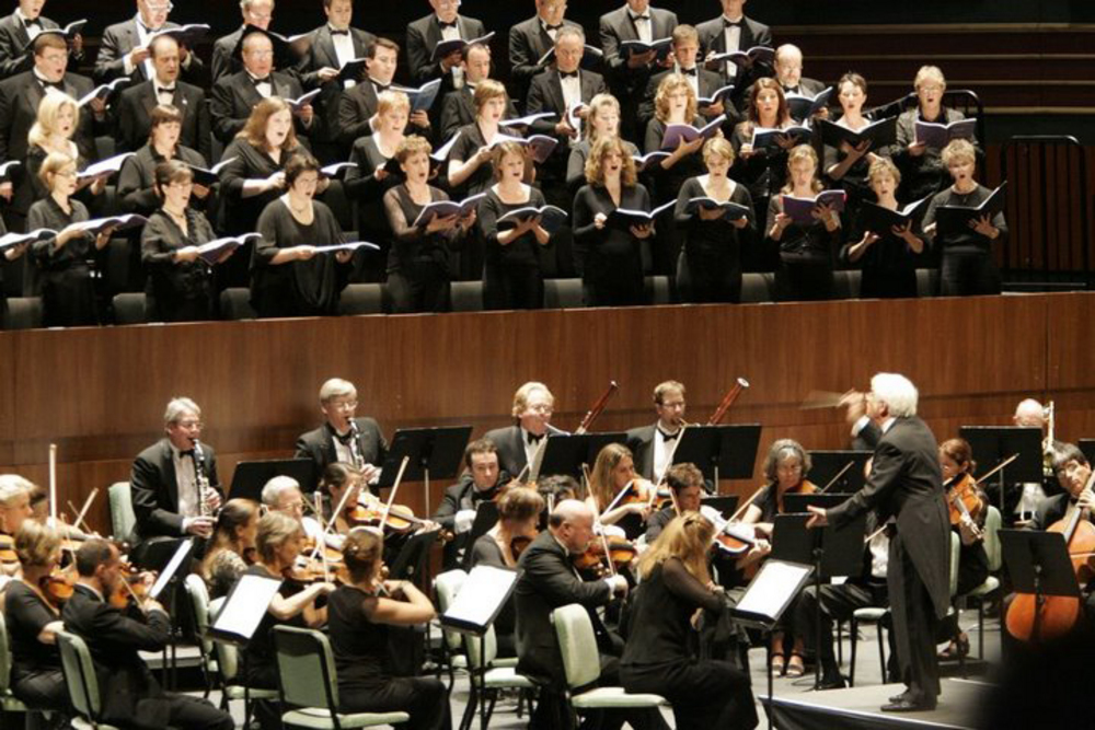 Helmuth Rilling conducting the Oregon Bach Festival chorus and orchestra.