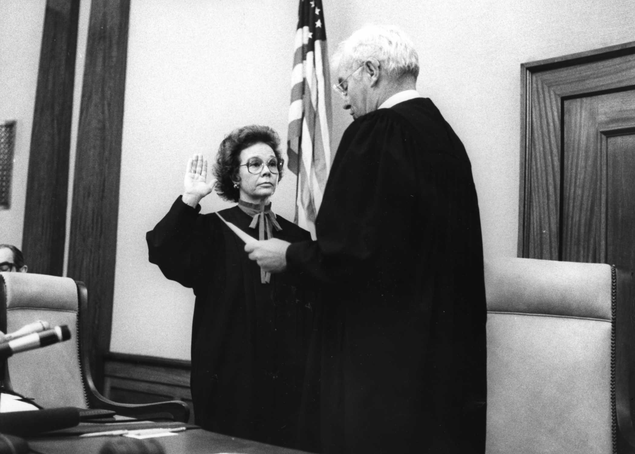 Betty Roberts being sworn in as Oregon Supreme Court Justice by Arno Denecke, 1982.