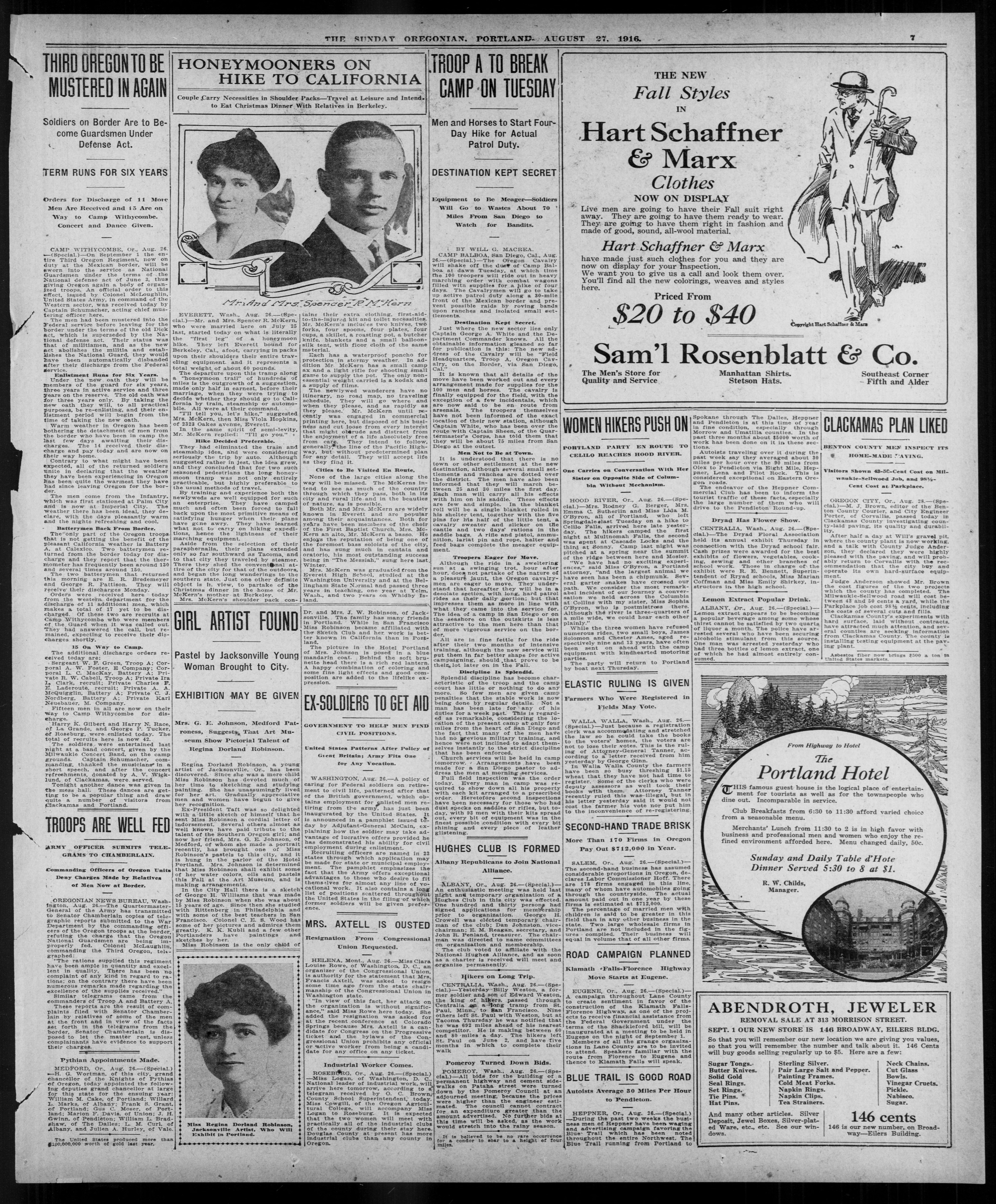 Oregonian news article about Robinson in Portland (bottom left), August 27, 1916.