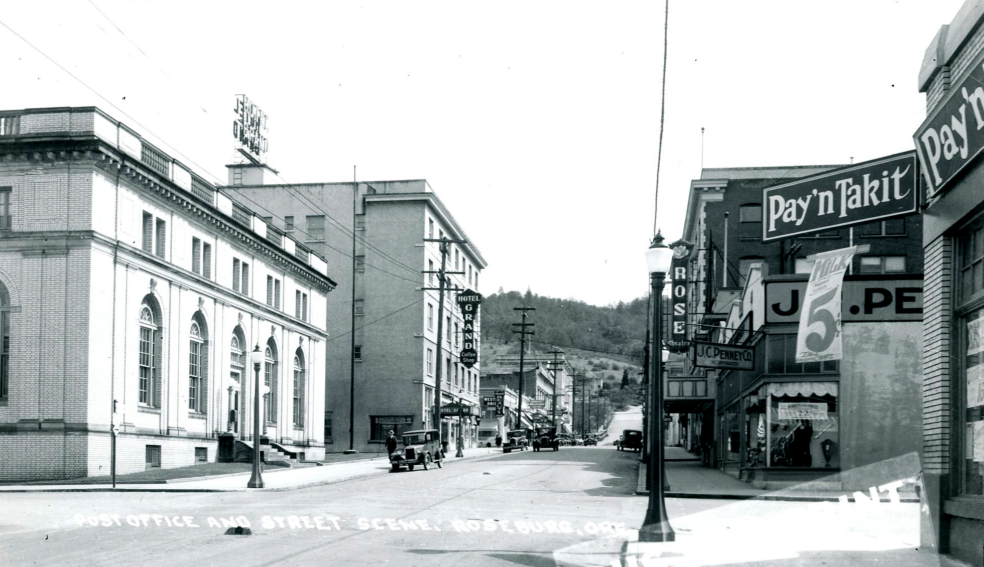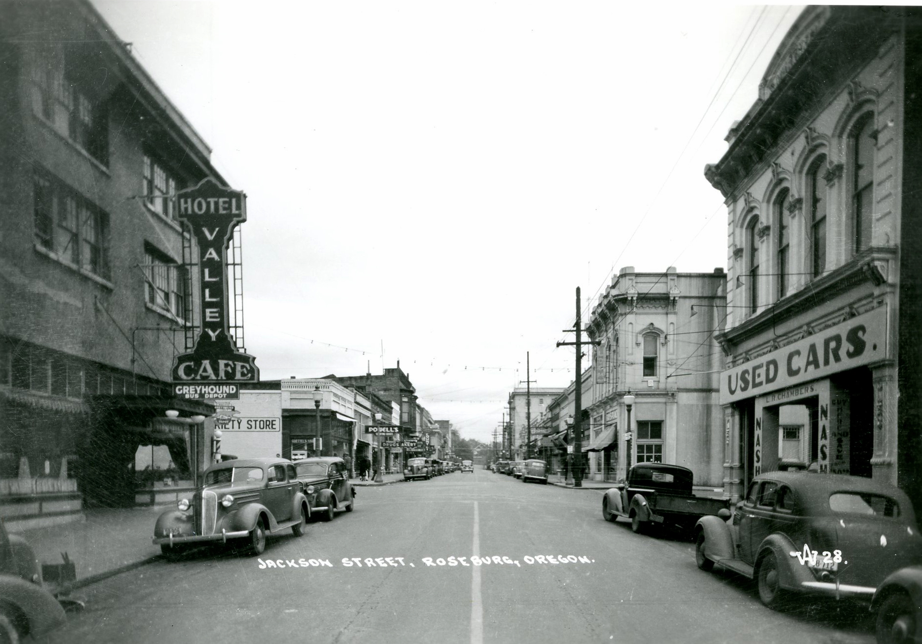 Farming was a key part of Roseburg’s early economy; prunes, turkeys, and hops were signature products. While agriculture remains important in the area, especially the cultivation of blueberries and grapes, the mid-twentieth century economy was largely based on logging. The town’s largest employer is Roseburg Forest Products, a privately owned wood products company founded by Kenneth Ford in 1936 as Roseburg Lumber. Other mills, including St. Helen’s Wood Products, which made broom handles, and the Saar Pencil Factory helped make the city a major lumber center. Roseburg thrived when World War II production and post-war growth called for significant amounts of spruce, fir, and plywood.