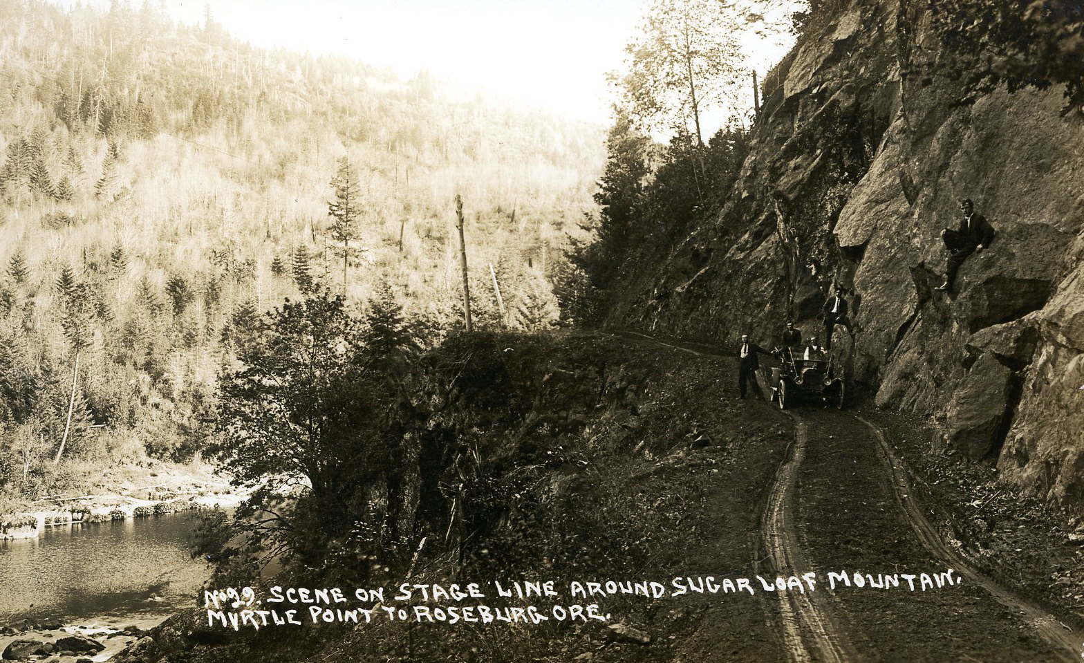 Stage line from Myrtle Point to Roseburg, around Sugar Loaf Mountain (Coos County), 1913.